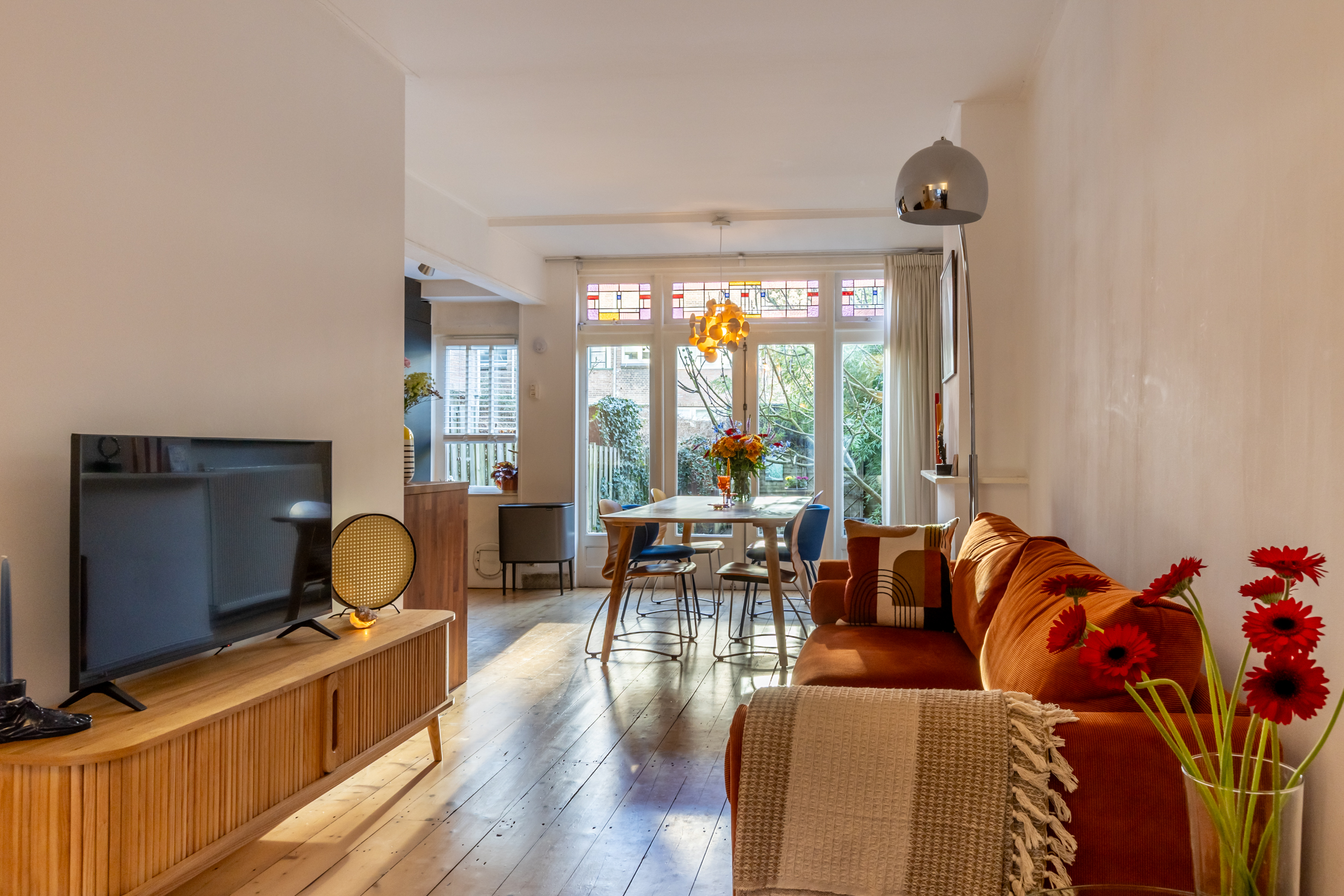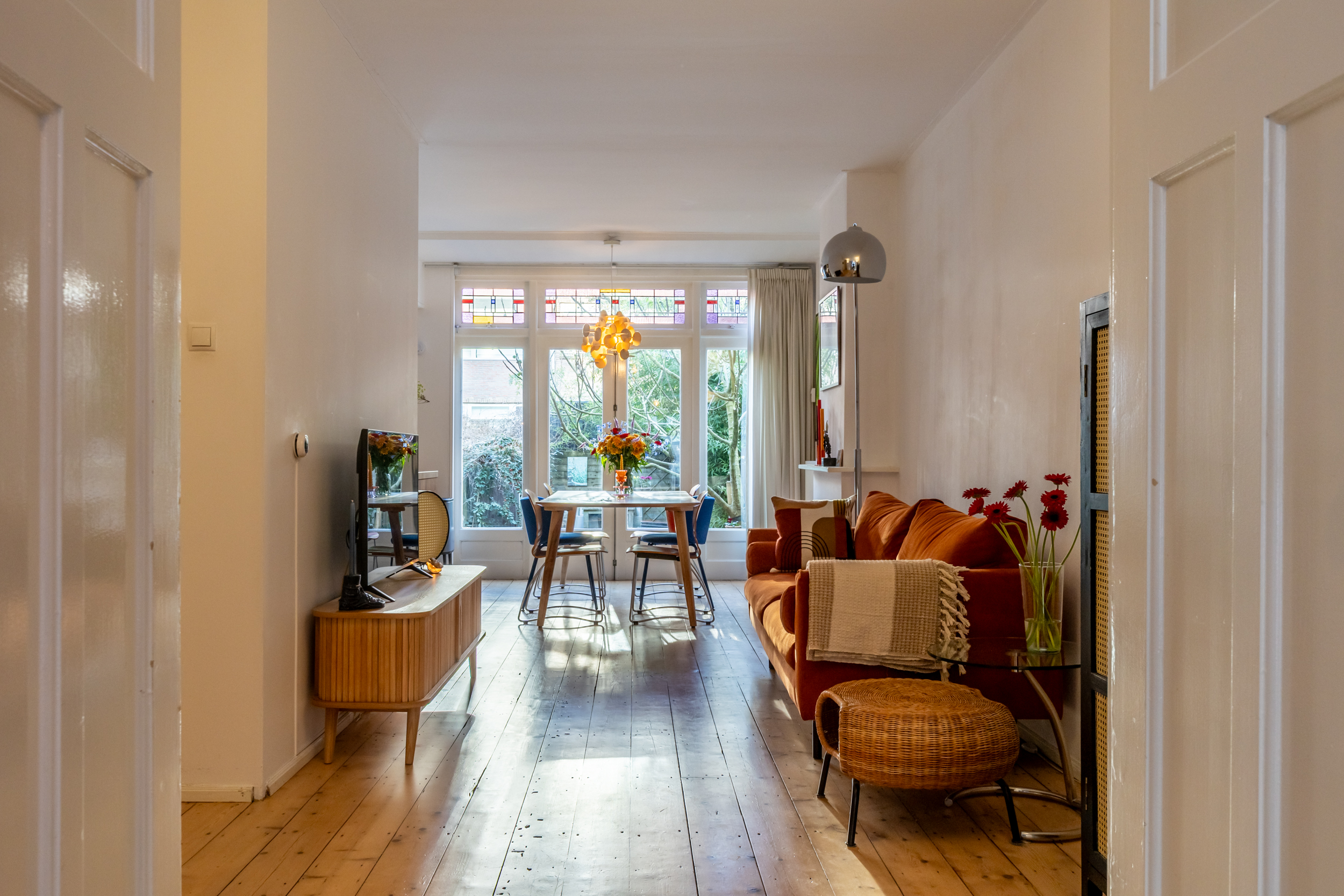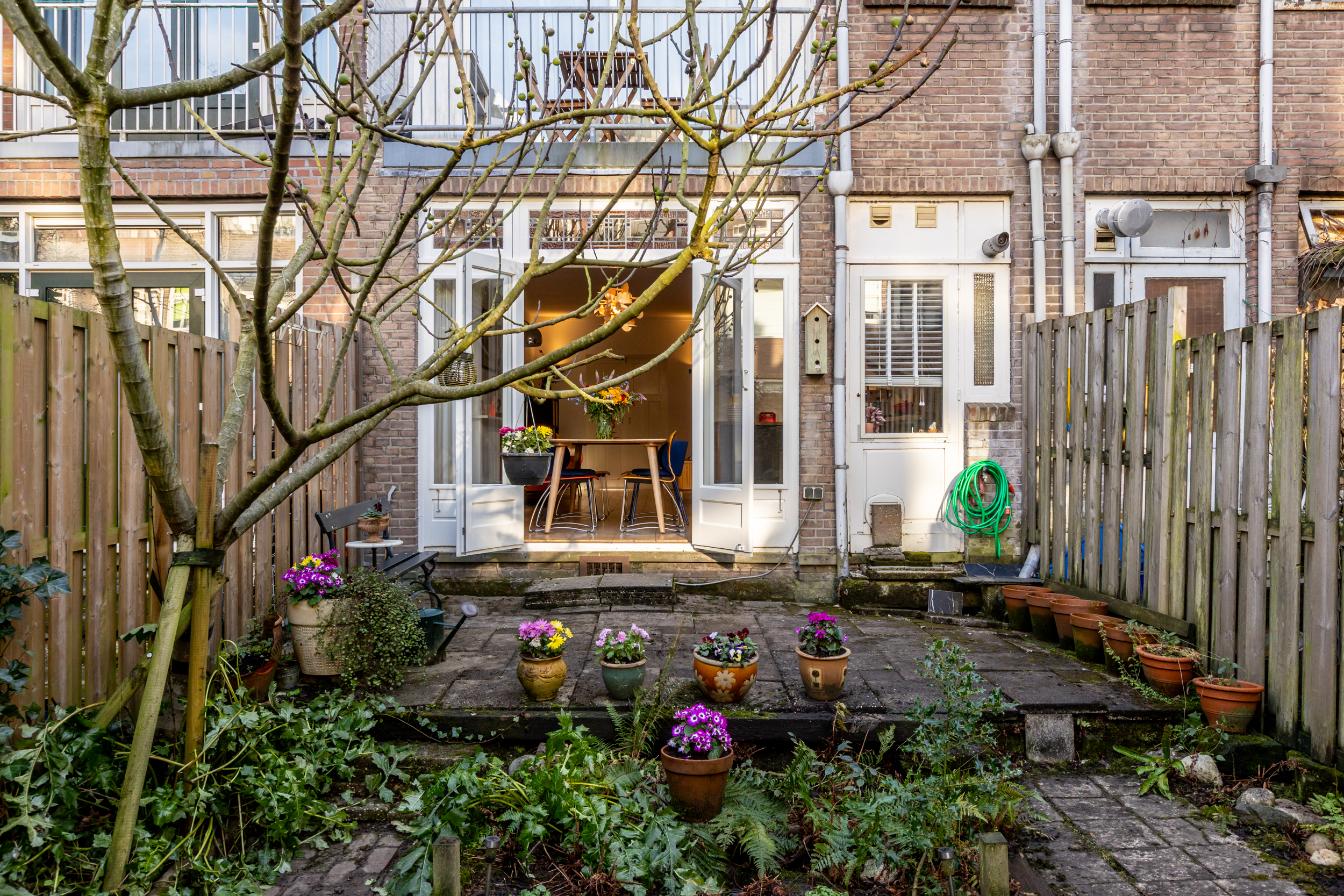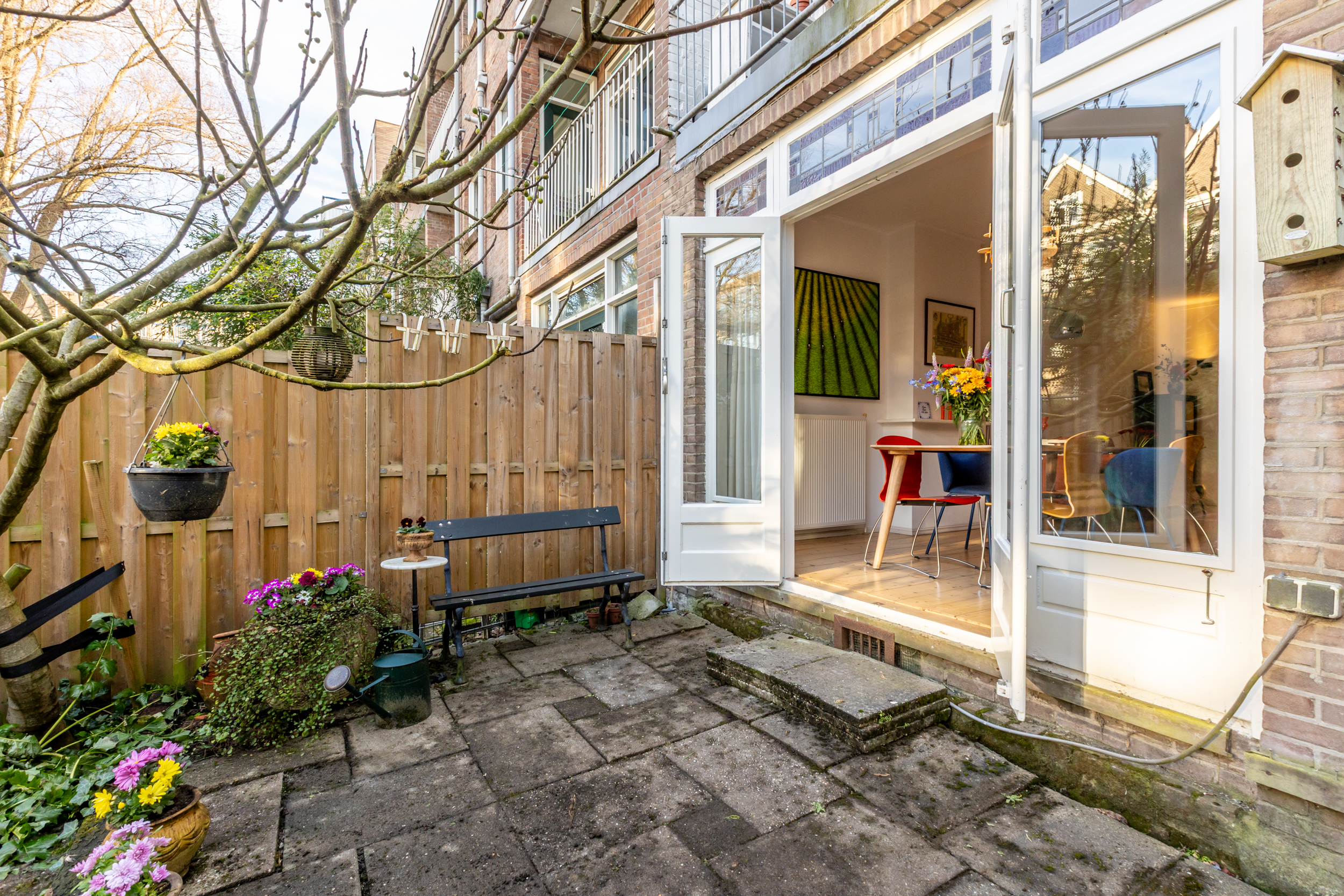 Dankzij de openslaande deuren met glas-in-lood stroomt het licht rijkelijk naar binnen en verbindt het binnen op natuurlijke wijze met buiten. De tuin op het noorden van circa 60 m2 is een echte groene oase midden in de stad. Of je nu geniet van een goed boek, een glas wijn of simpelweg de rust van het buiten zijn, deze tuin is een plek om te genieten.