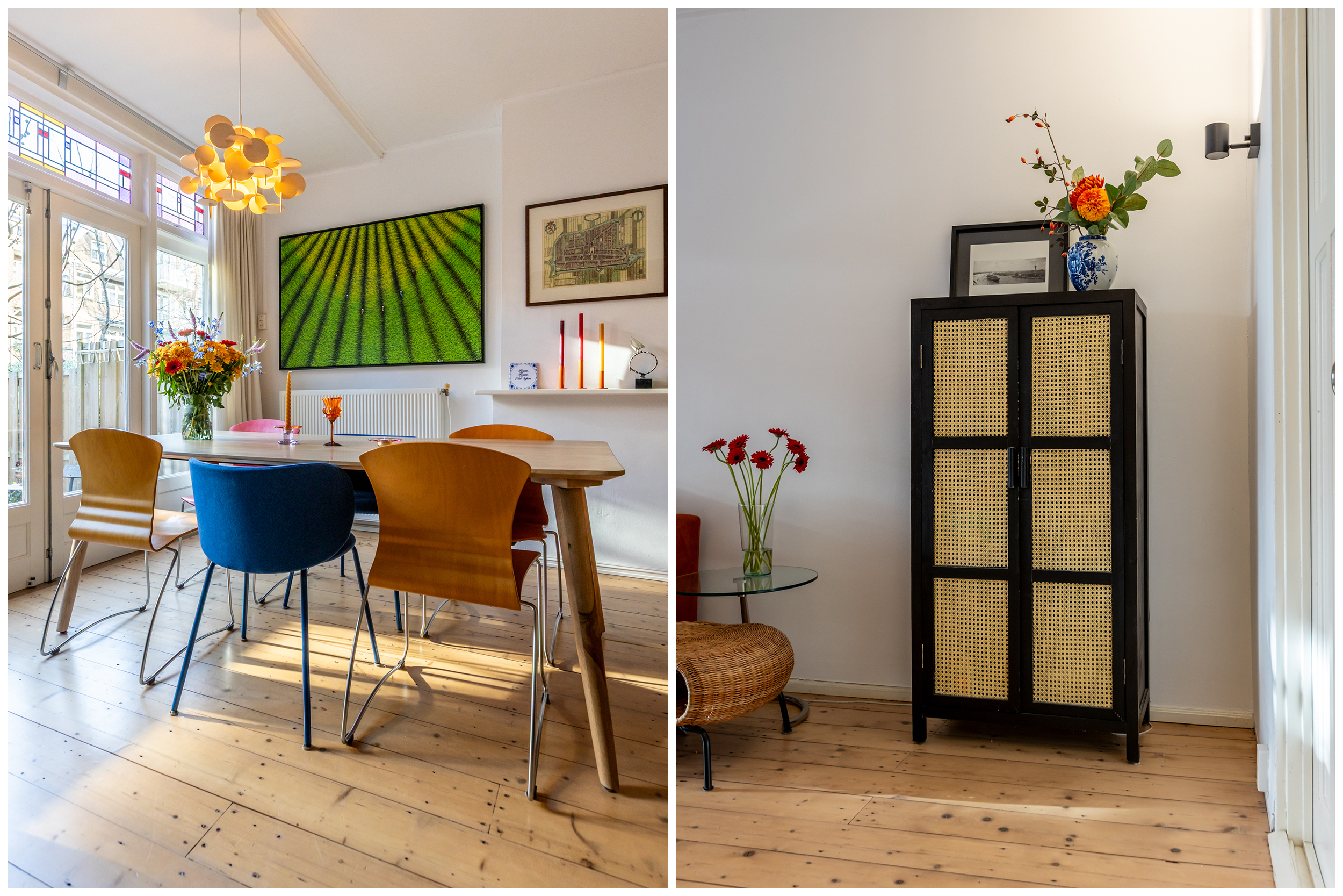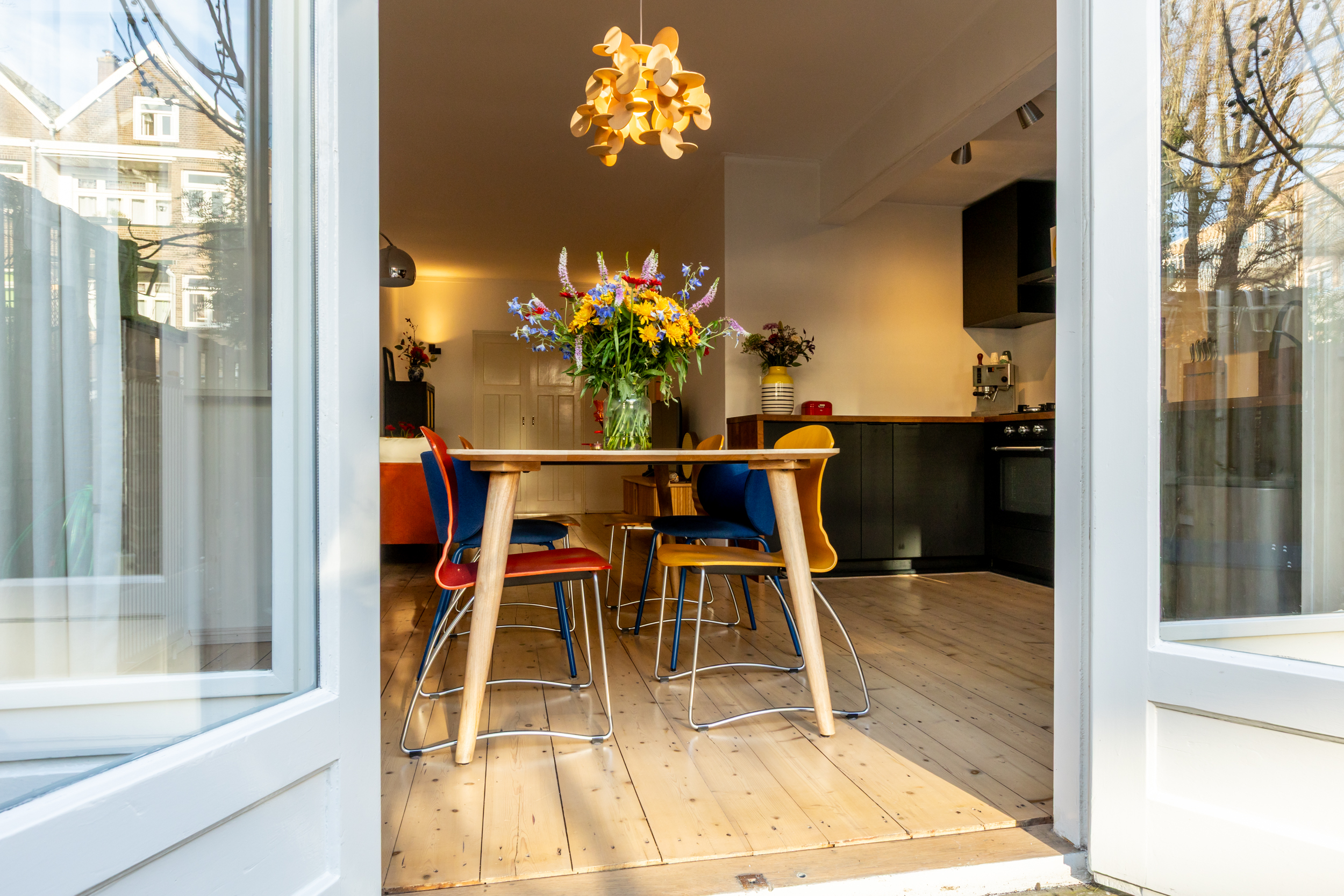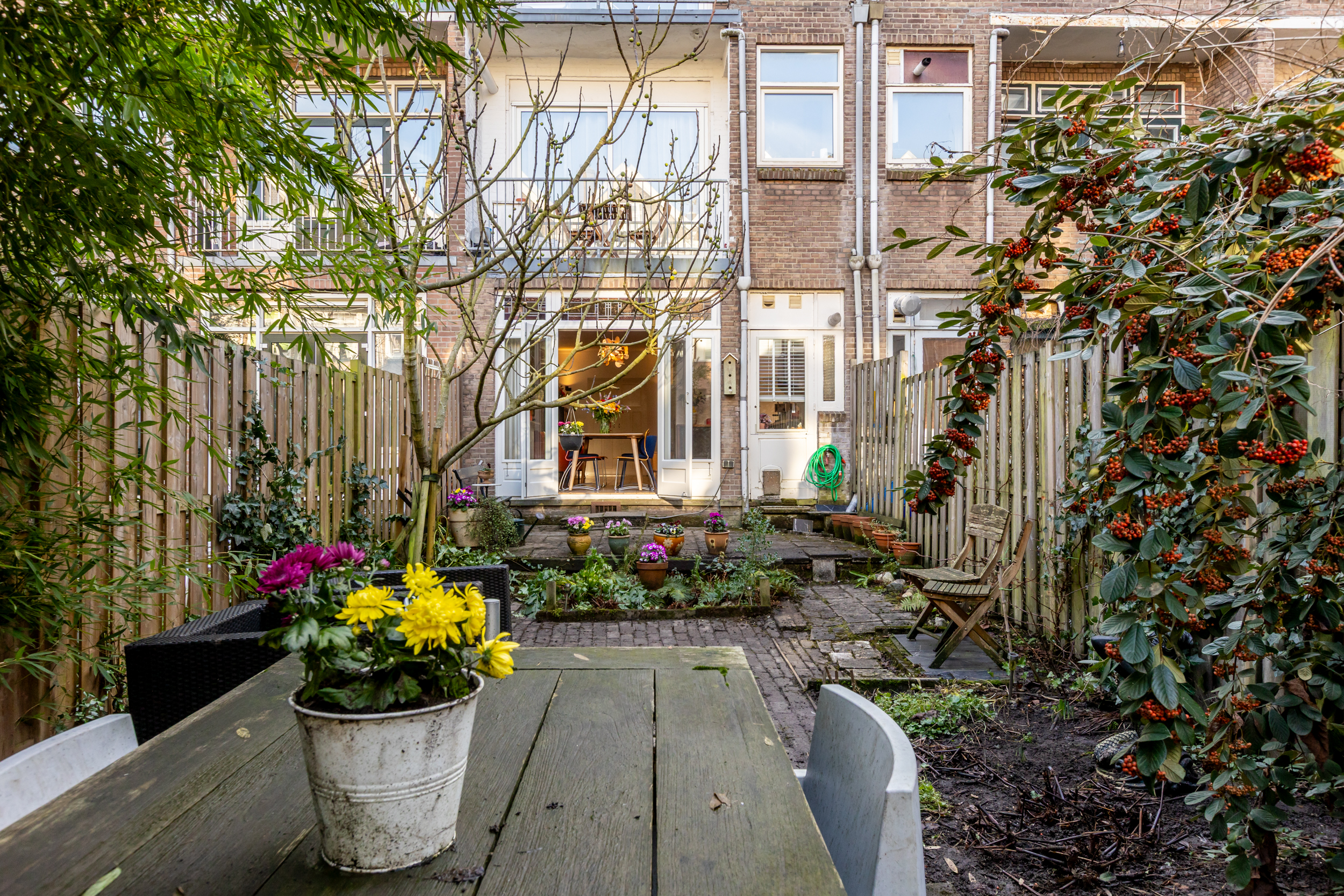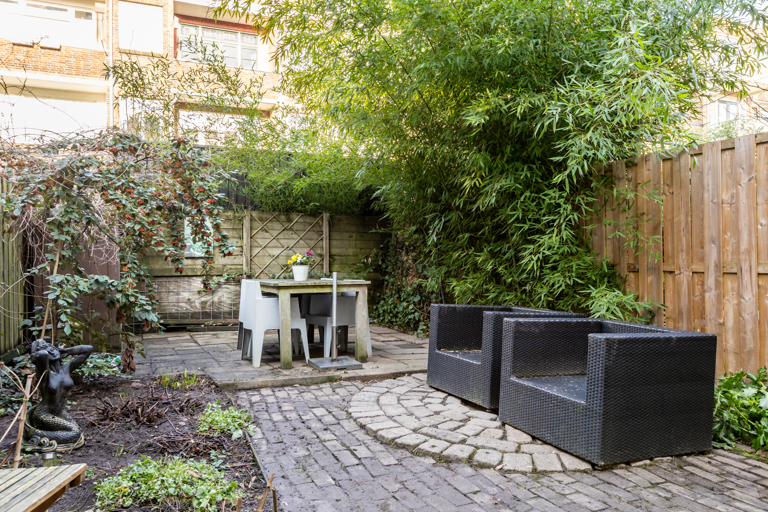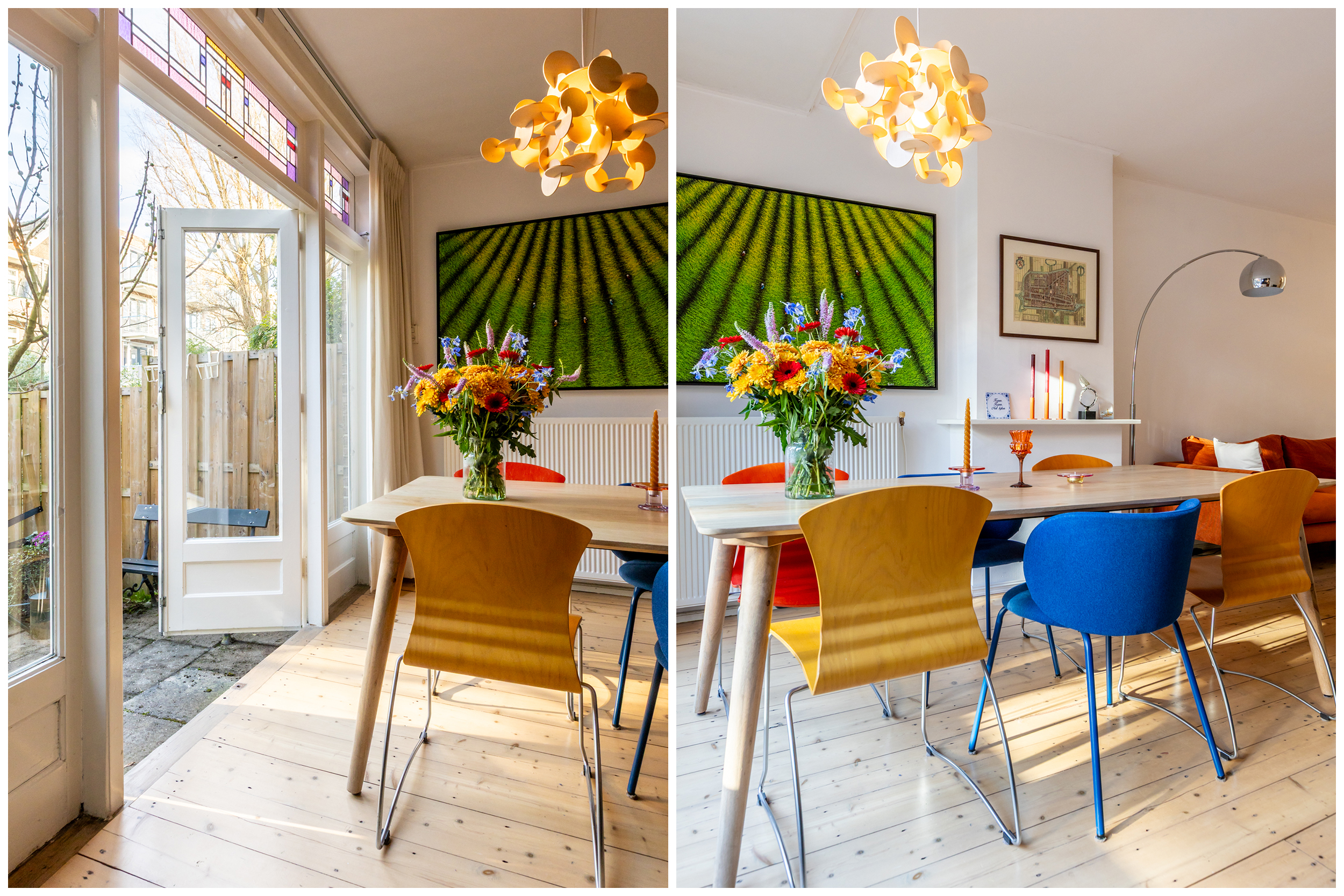 Dankzij de openslaande deuren met glas-in-lood stroomt het licht rijkelijk naar binnen en verbindt het binnen op natuurlijke wijze met buiten. De tuin op het noorden van circa 60 m2 is een echte groene oase midden in de stad. Of je nu geniet van een goed boek, een glas wijn of simpelweg de rust van het buiten zijn, deze tuin is een plek om te genieten.