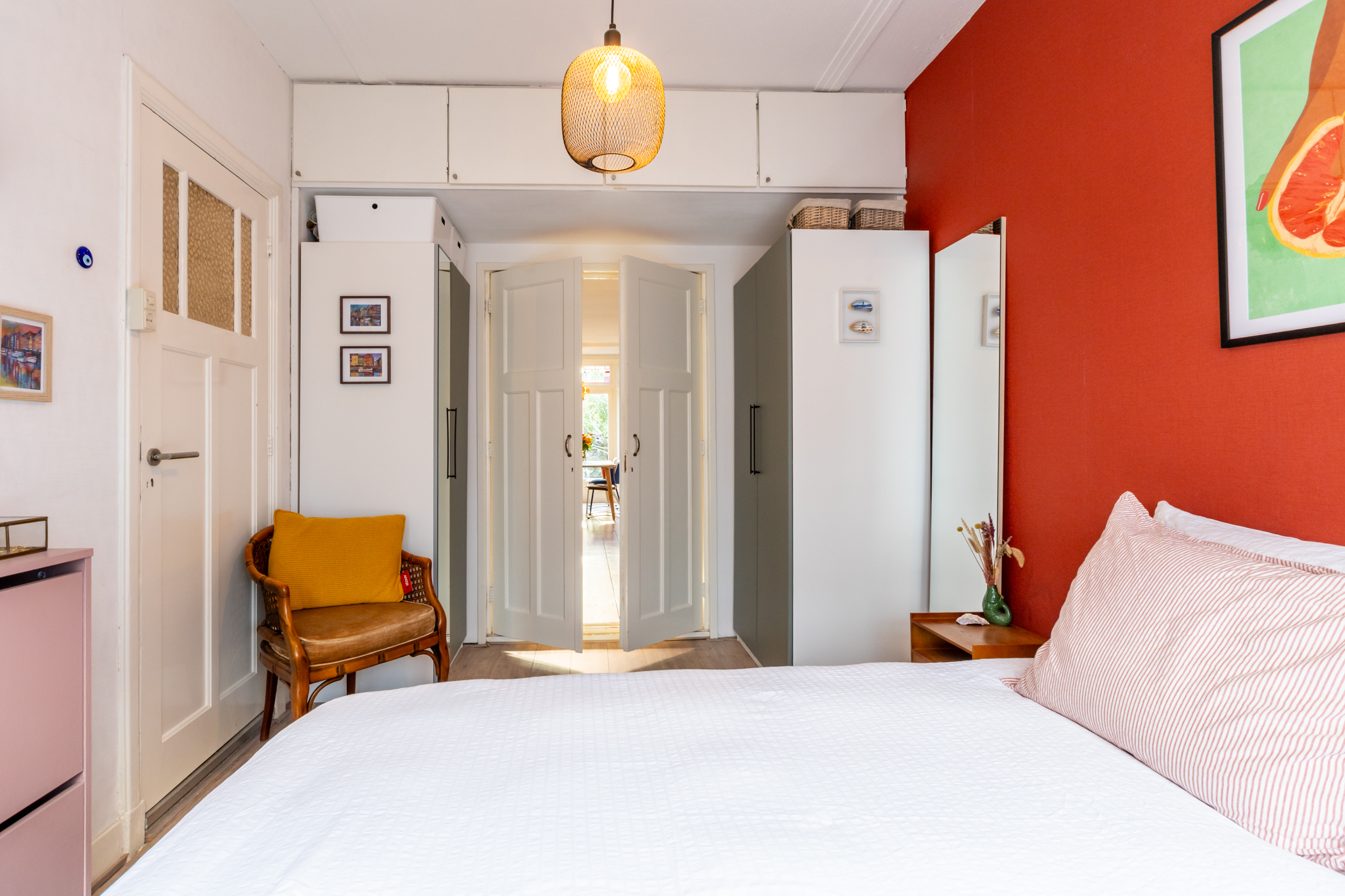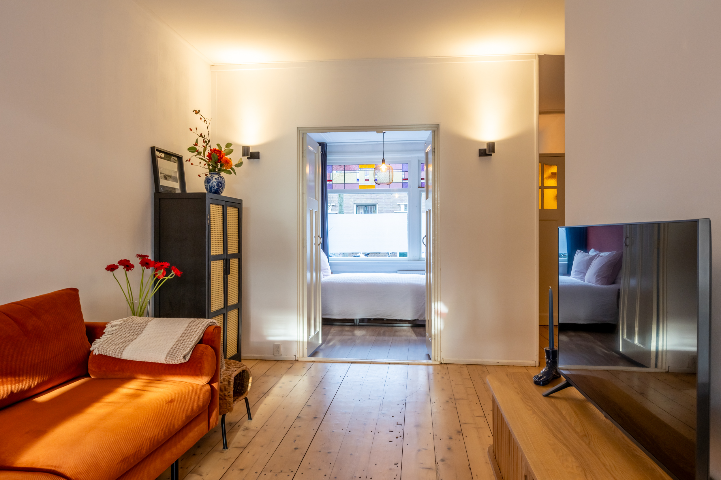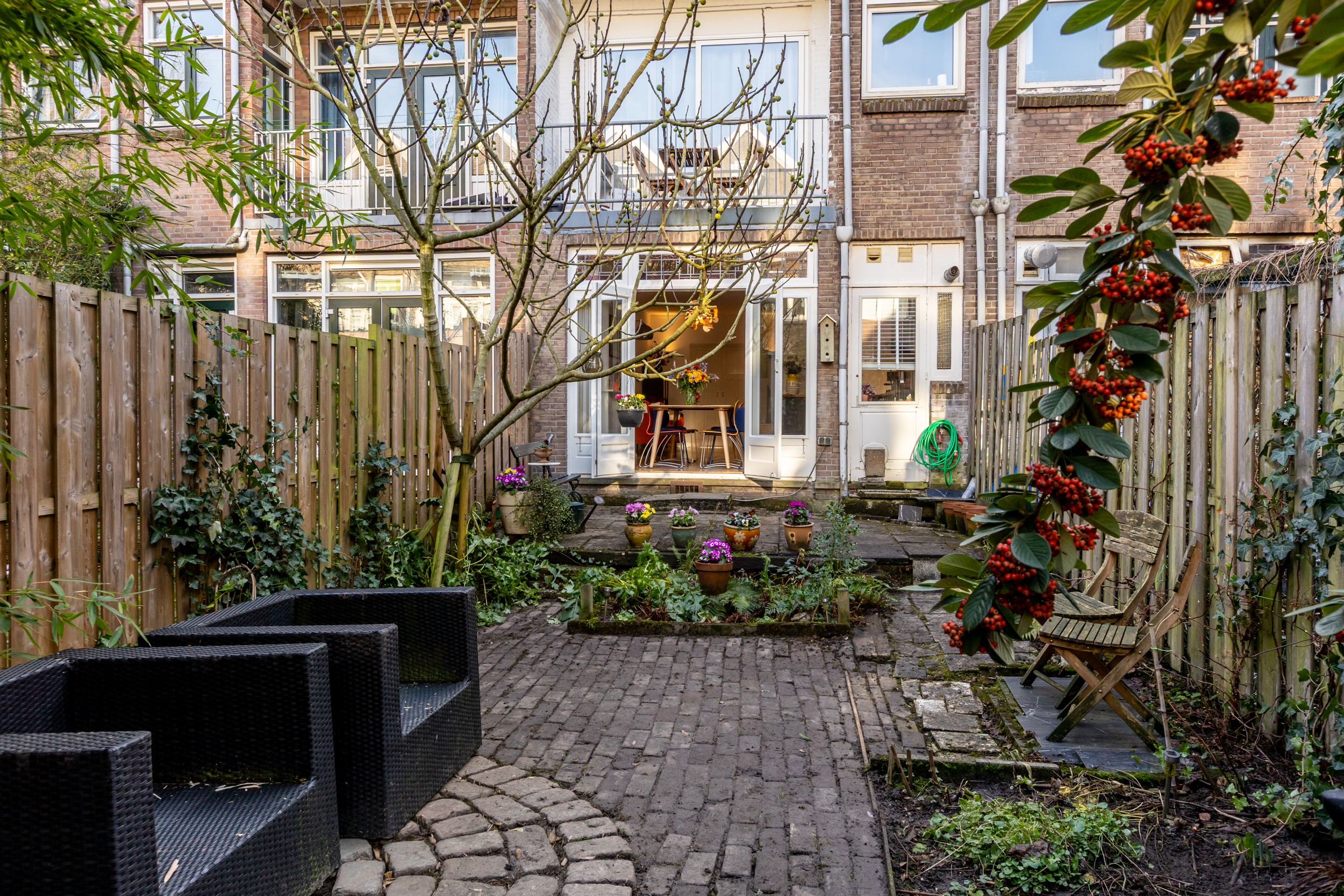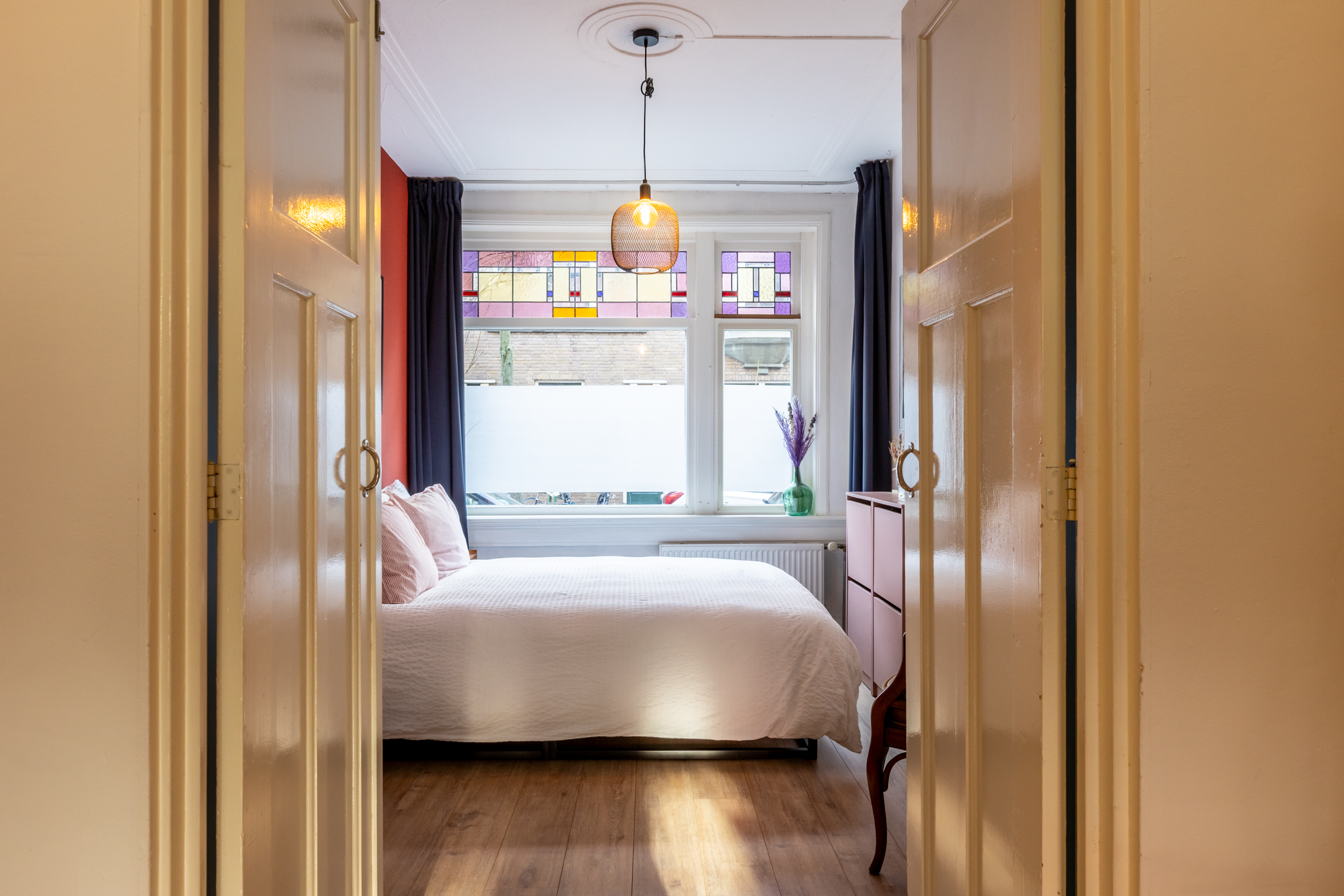 Dankzij de openslaande deuren met glas-in-lood stroomt het licht rijkelijk naar binnen en verbindt het binnen op natuurlijke wijze met buiten. De tuin op het noorden van circa 60 m2 is een echte groene oase midden in de stad. Of je nu geniet van een goed boek, een glas wijn of simpelweg de rust van het buiten zijn, deze tuin is een plek om te genieten.