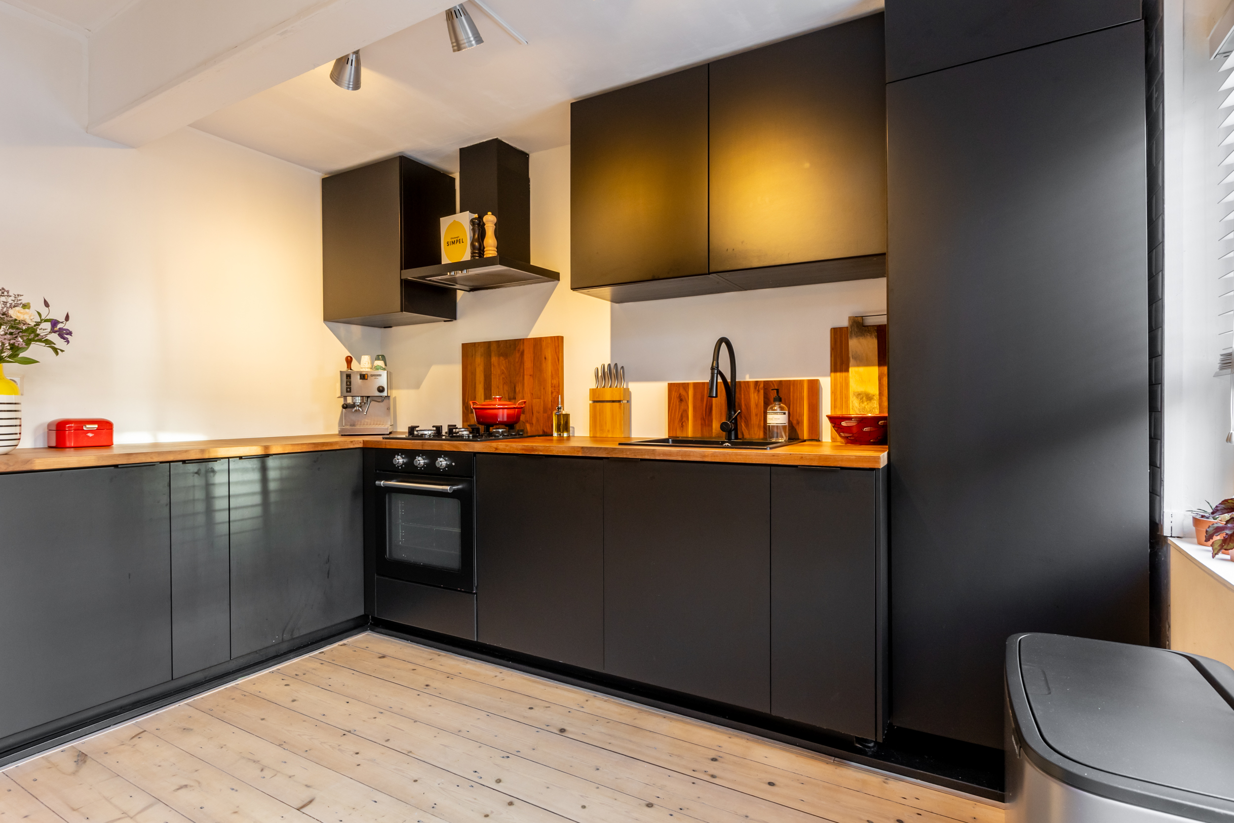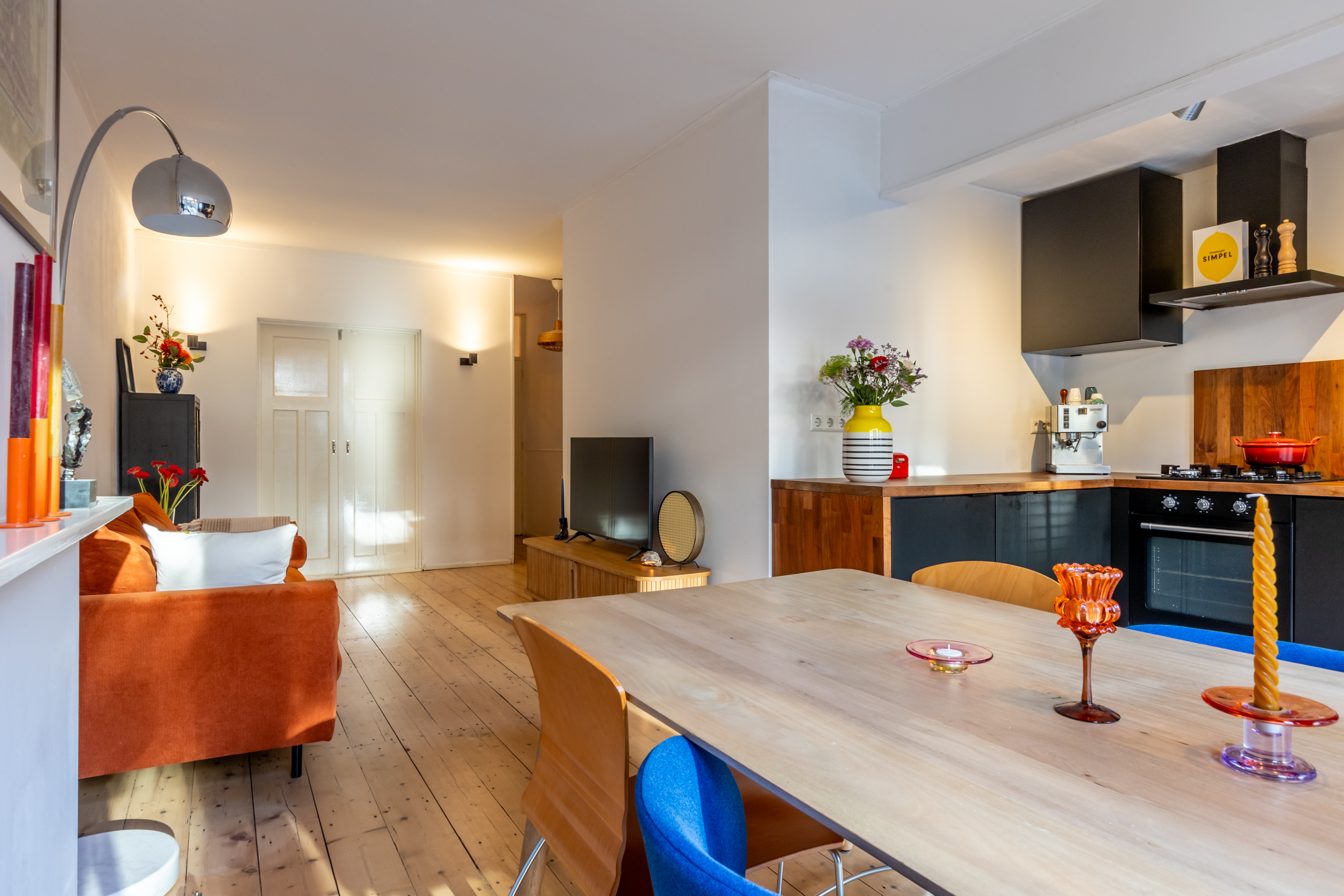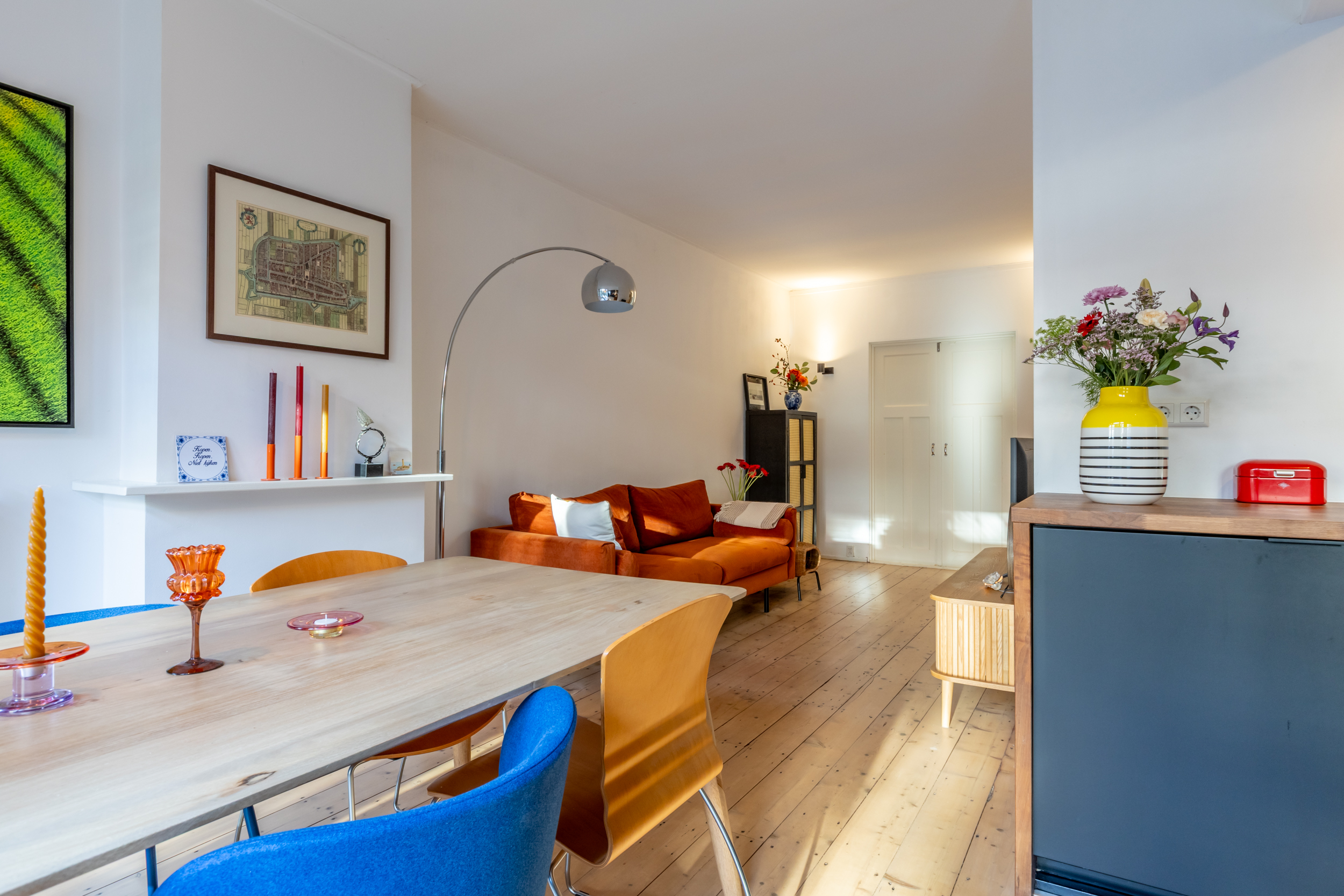Via de entree betreed je de ruim opgezette living. Een uitnodigende leefruimte met een warme, huiselijke sfeer dankzij de prachtige houten vloer en de originele glas-in-looddetails. Het knusse zitgedeelte vormt het hart van de ruimte en loopt vloeiend over in het eetgedeelte en de open keuken aan de achterzijde van de woning. Het dagelijkse leven ontvouwt zich hier in een natuurlijke flow van koken, samen eten en ontspannen genieten. De keuken is uitgerust met een 4-pits gasfornuis met oven, afzuigkap, koelkast en vaatwasser. Alles wat je nodig hebt om met plezier te koken!