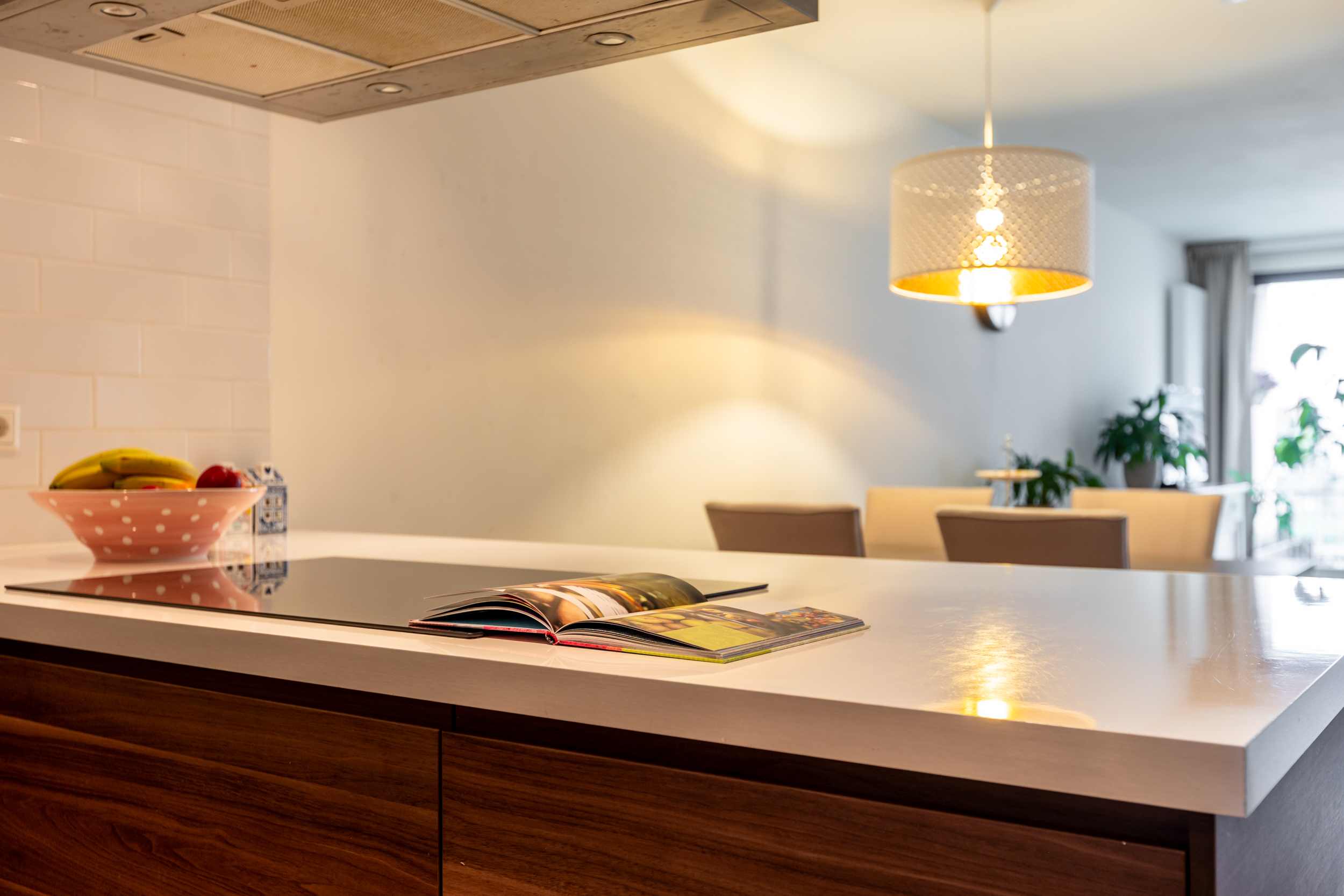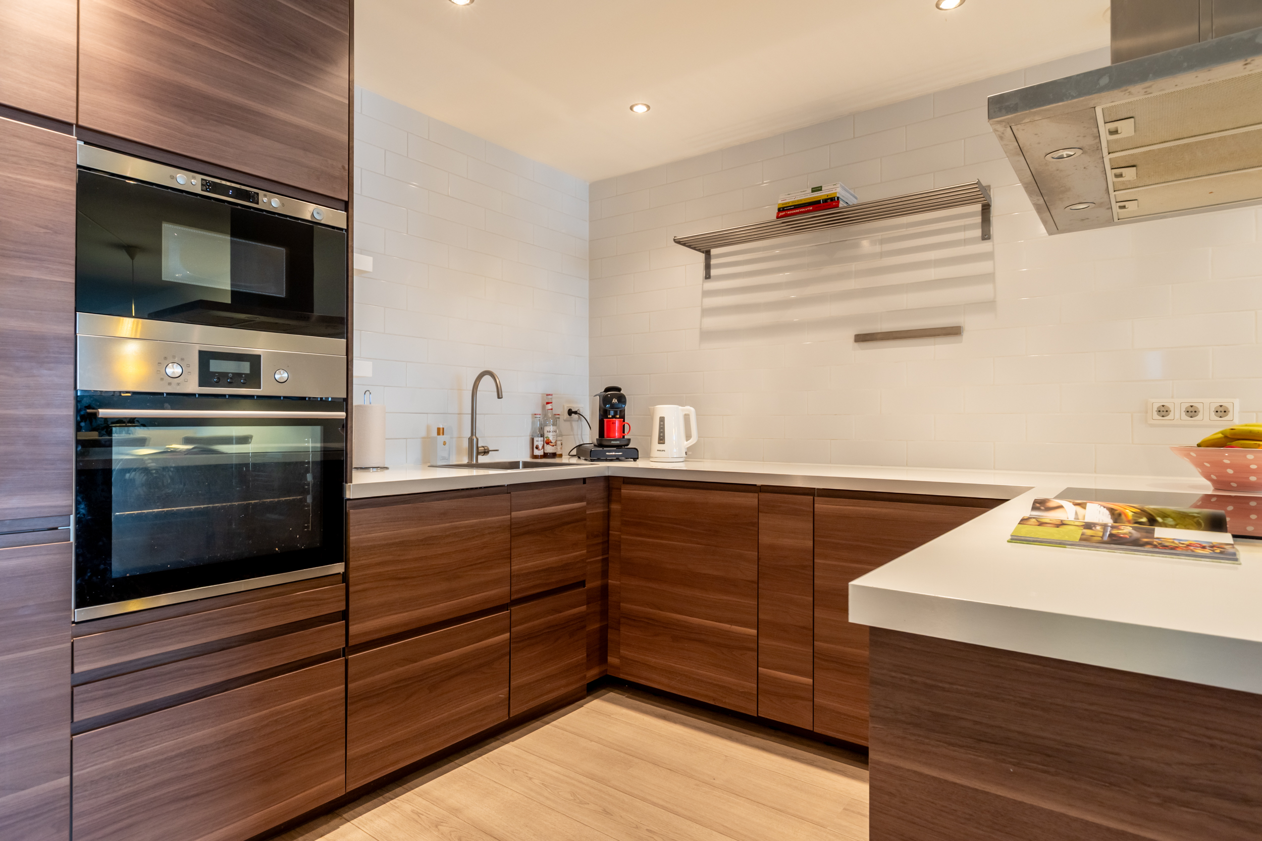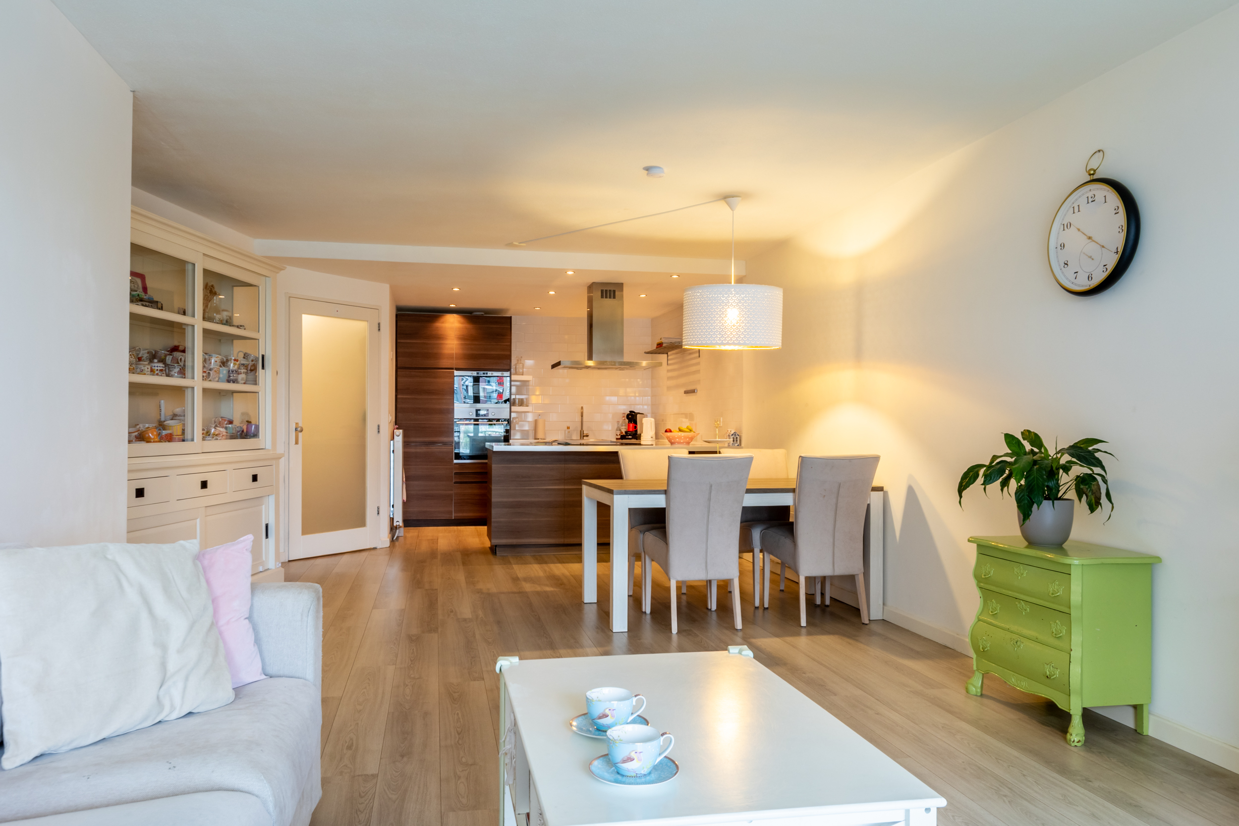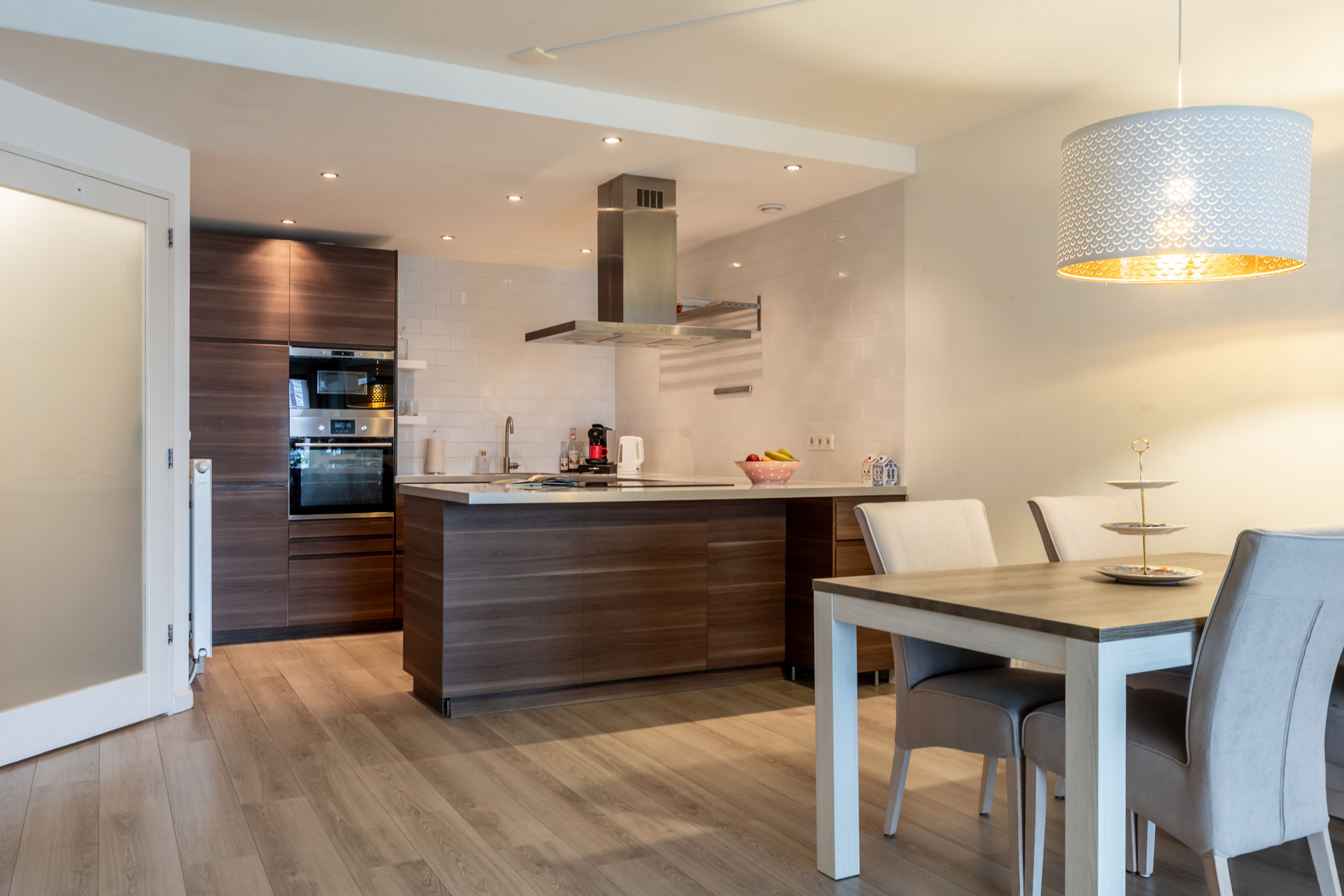 Middels de ruime entree zijn alle vertrekken te bereiken. Het leefgedeelte strekt zich uit over de volledige lengte van de woning en is voorzien van een nette laminaatvloer die door de gehele woning is doorgelegd. Wat een ruimte voor een gezellige zit- en eethoek om de perfecte thuisbasis te creëren! Vanaf de bank kijk je uit over het water, wat zorgt voor een rustgevend en ontspannen gevoel. De schuifpui geeft toegang tot het balkon (circa 7 m2) met doorgang naar de tuin (circa 23 m2), die is gelegen op het westen. Perfect om bij mooi weer als verlengstuk van de woonkamer te gebruiken, zodat het ook buitenshuis optimaal vertoeven is. De tuin is echt one of a kind! Binnen dit complex beschikken maar weinig woningen over een eigen tuin. Een zeldzaam privilege dat dit appartement onderscheidt van de rest! Terug in de woning, aan de andere zijde, bevindt zich de open keuken met kookeiland. Dit is écht een moderne toevoeging aan de woning en van alle luxe voorzien, zoals een inductiekookplaat, afzuigkap, magnetron, oven, koel- en vriescombinatie en een vaatwasser. Koken kan hier op zijn best!