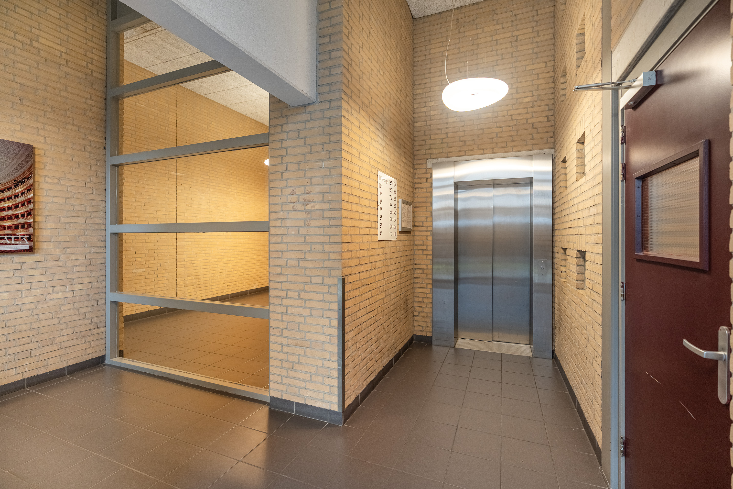Gesloten entree met bellentableau, brievenbussen en lift.