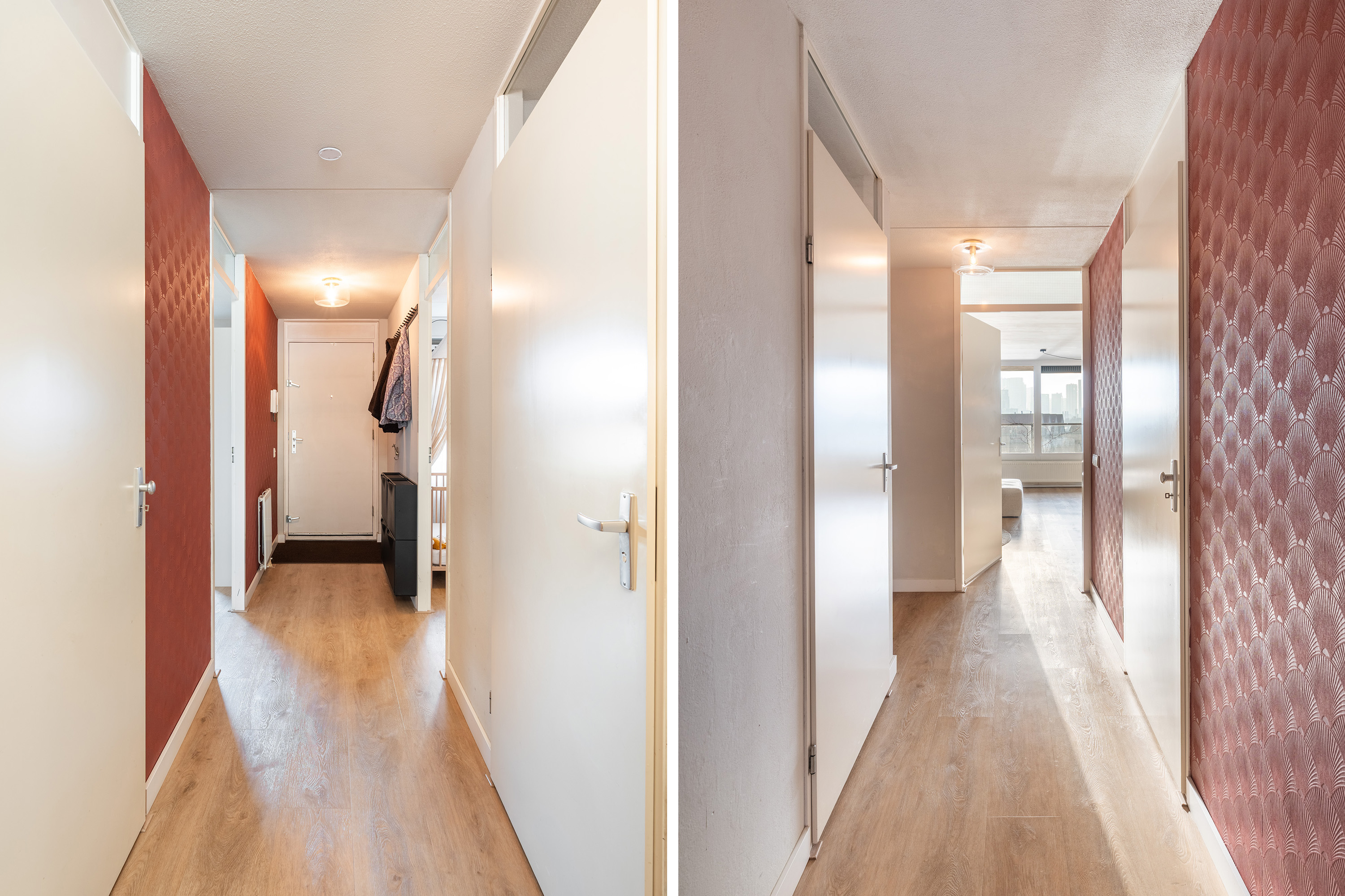 Kom binnen in de ruime entree welke toegang verleent tot verschillende vertrekken waaronder de living. De riante woonkamer is een oase van licht en rust en geheel in te richten naar smaak. Dankzij de volledige glazen gevel aan de westzijde baadt de ruimte in daglicht en heb je een indrukwekkend uitzicht over de skyline van Rotterdam. De warme PVC-vloer loopt naadloos door en vormt een rustige basis. Hier geniet je van een geborgen, moderne sfeer waar elke dag aanvoelt als thuiskomen.