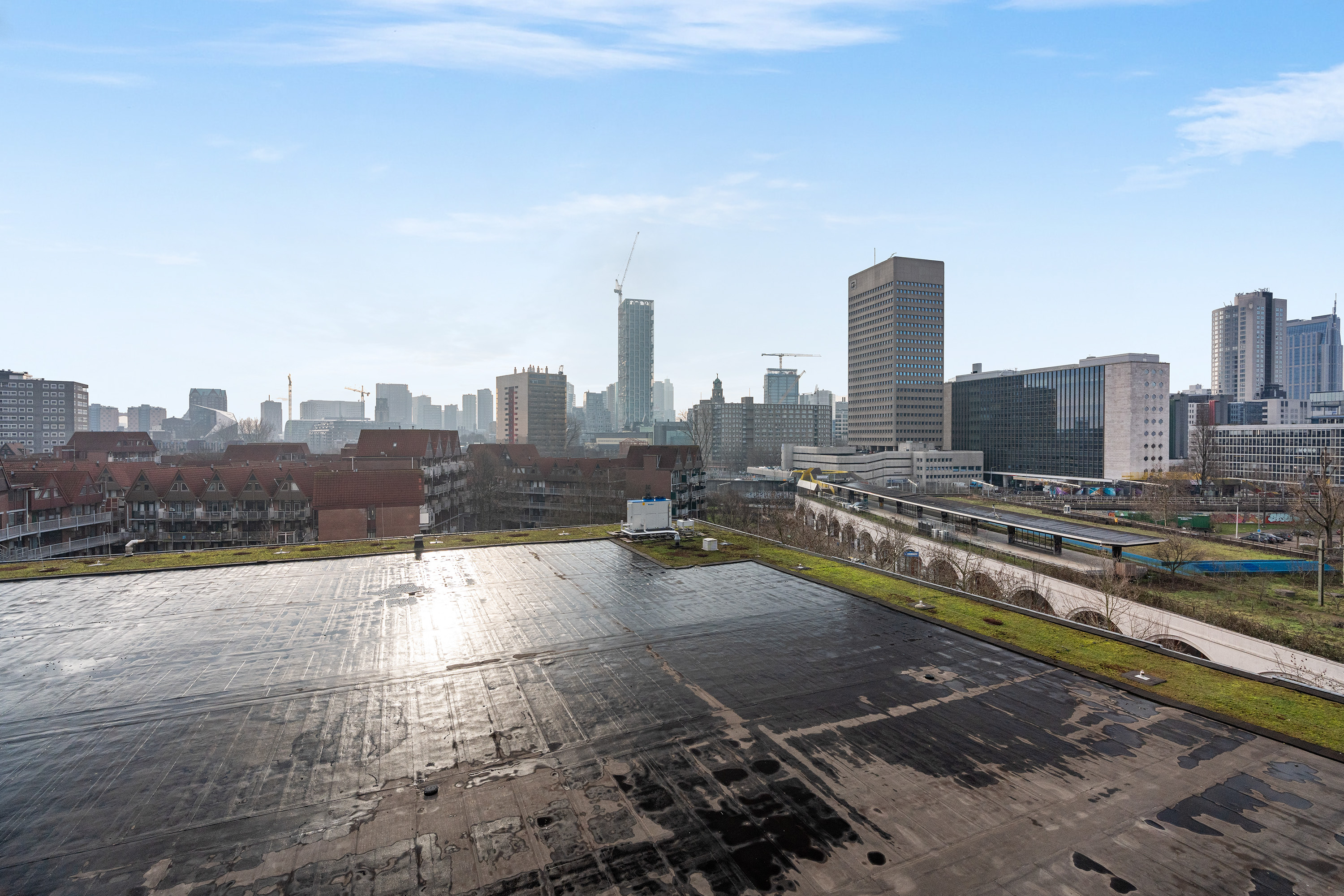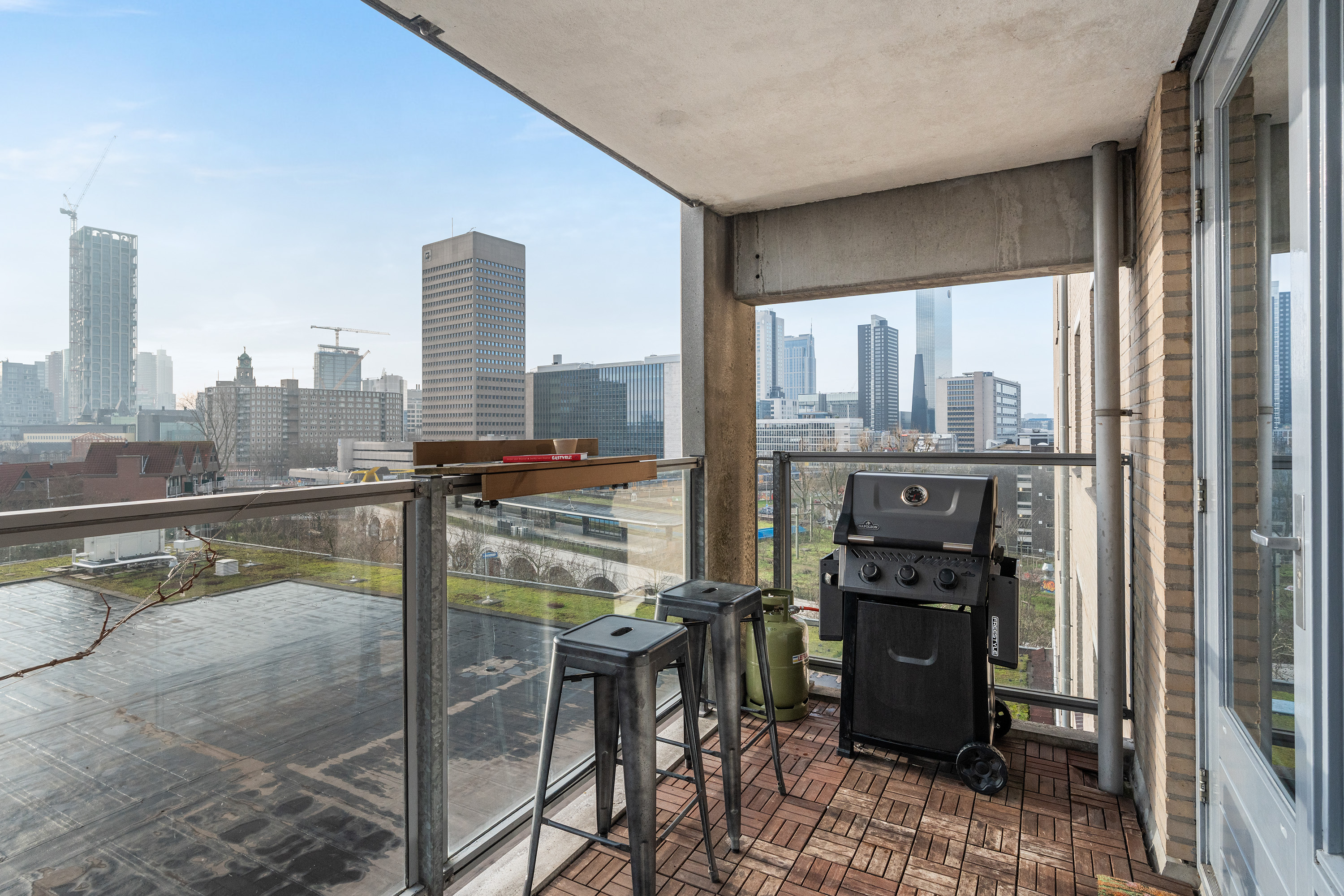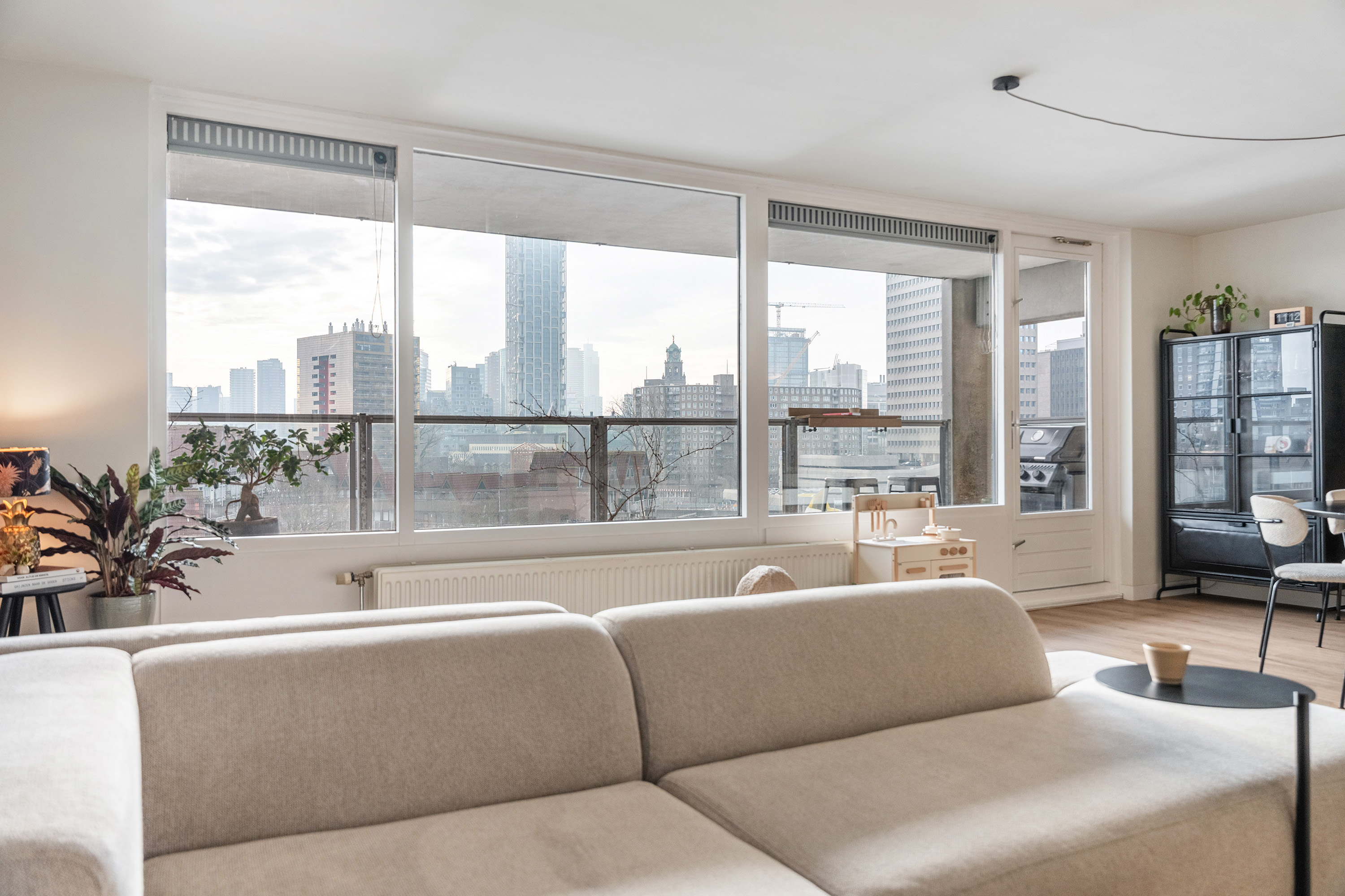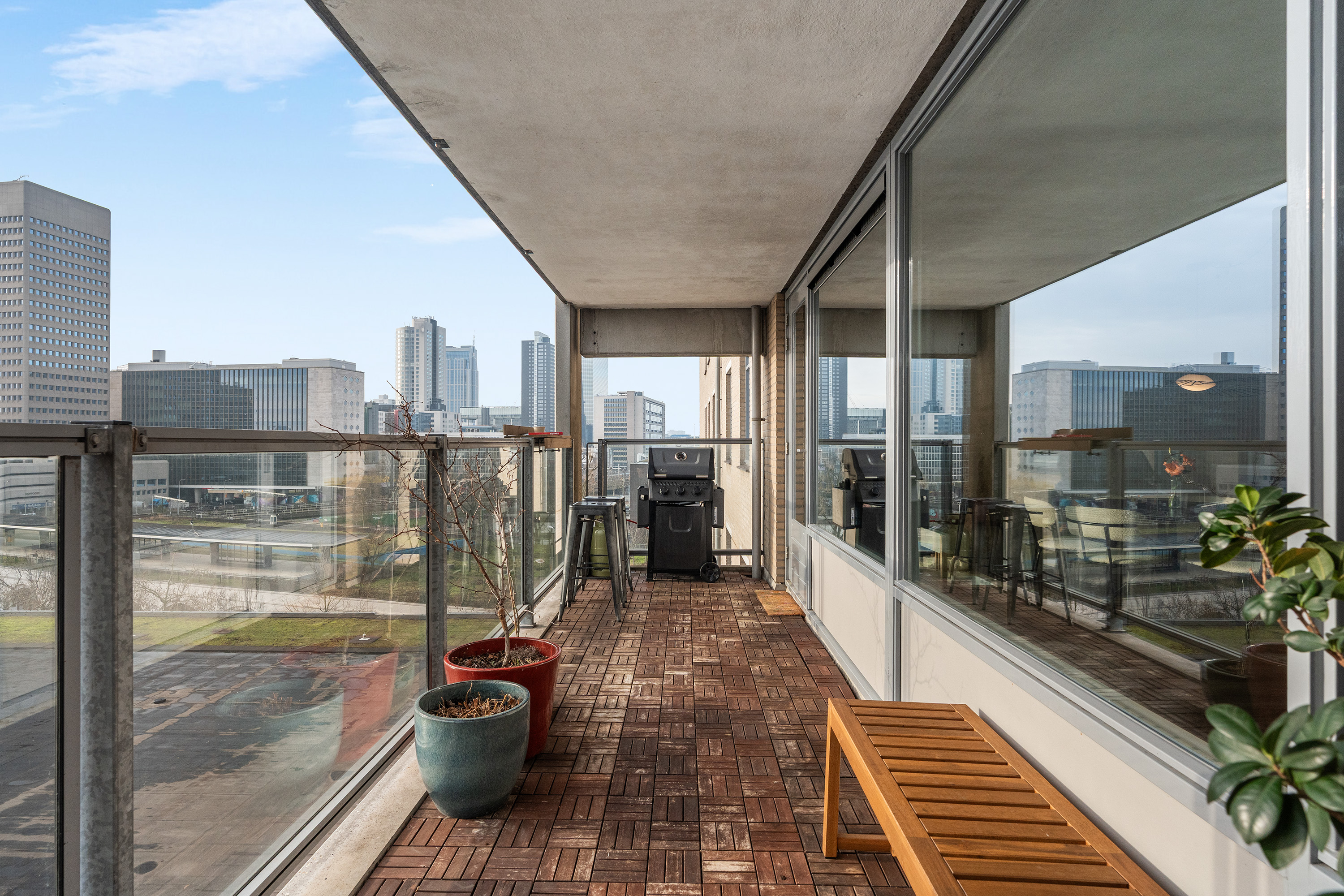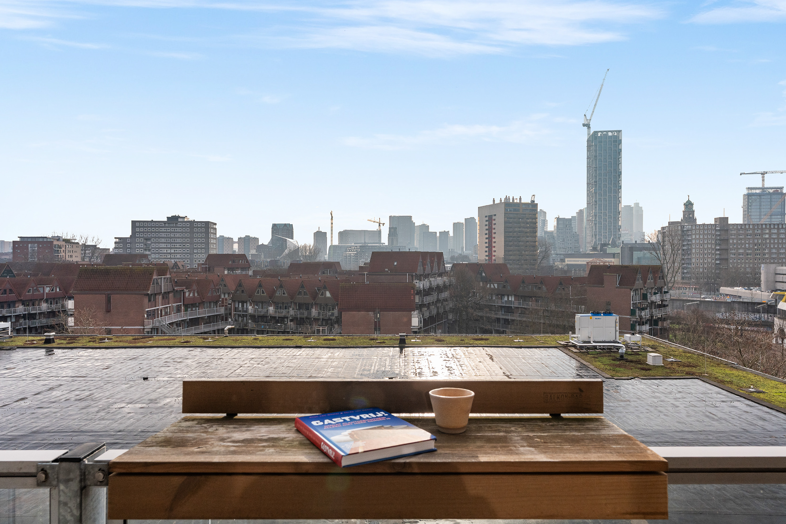 Vanuit de woonkamer stap je zó het royale balkon op van ca. 13 m2. Vanaf hier heb je een prachtig uitzicht over de Rotterdamse binnenstad. De ideale plek voor ontbijt in de ochtendzon of borrels bij zonsondergang.