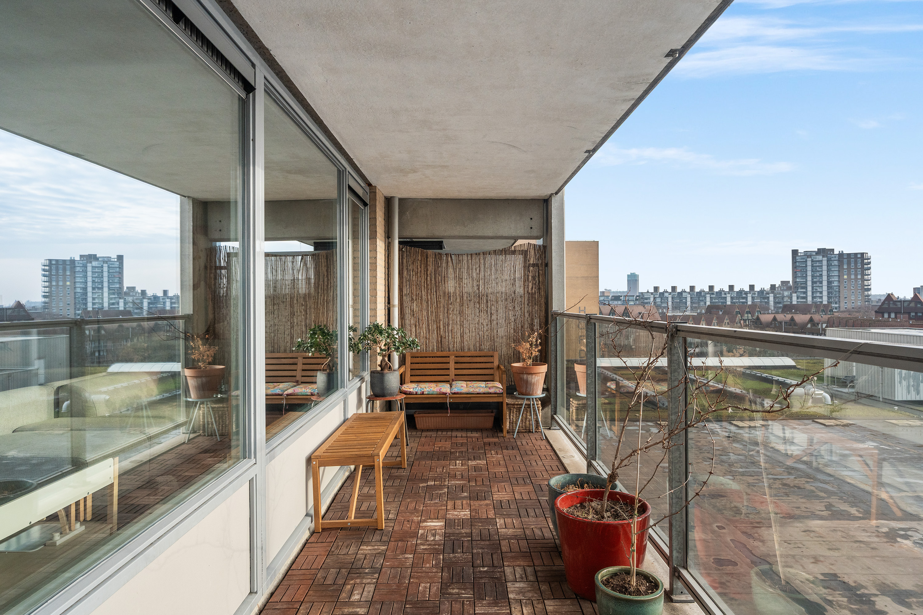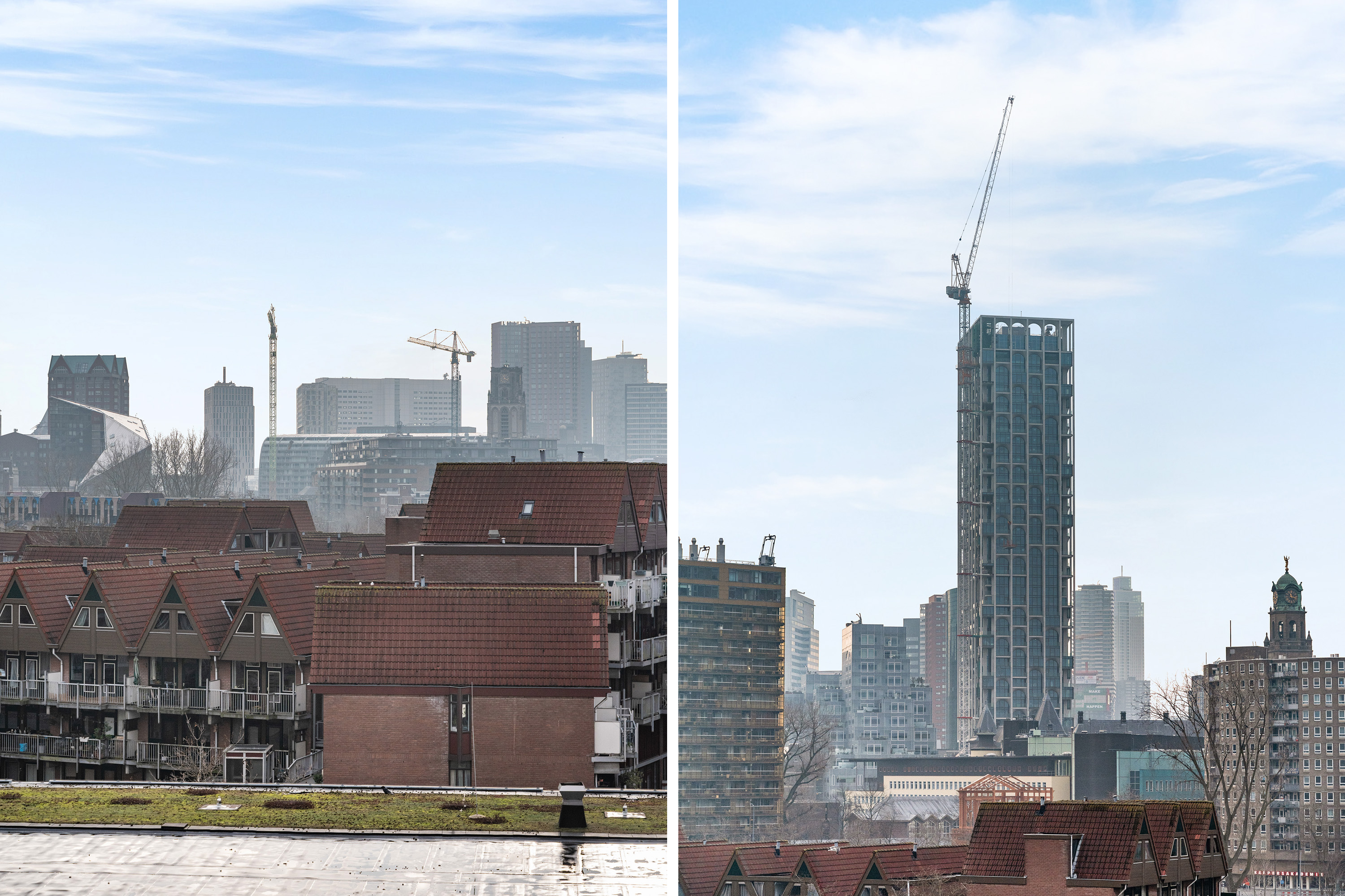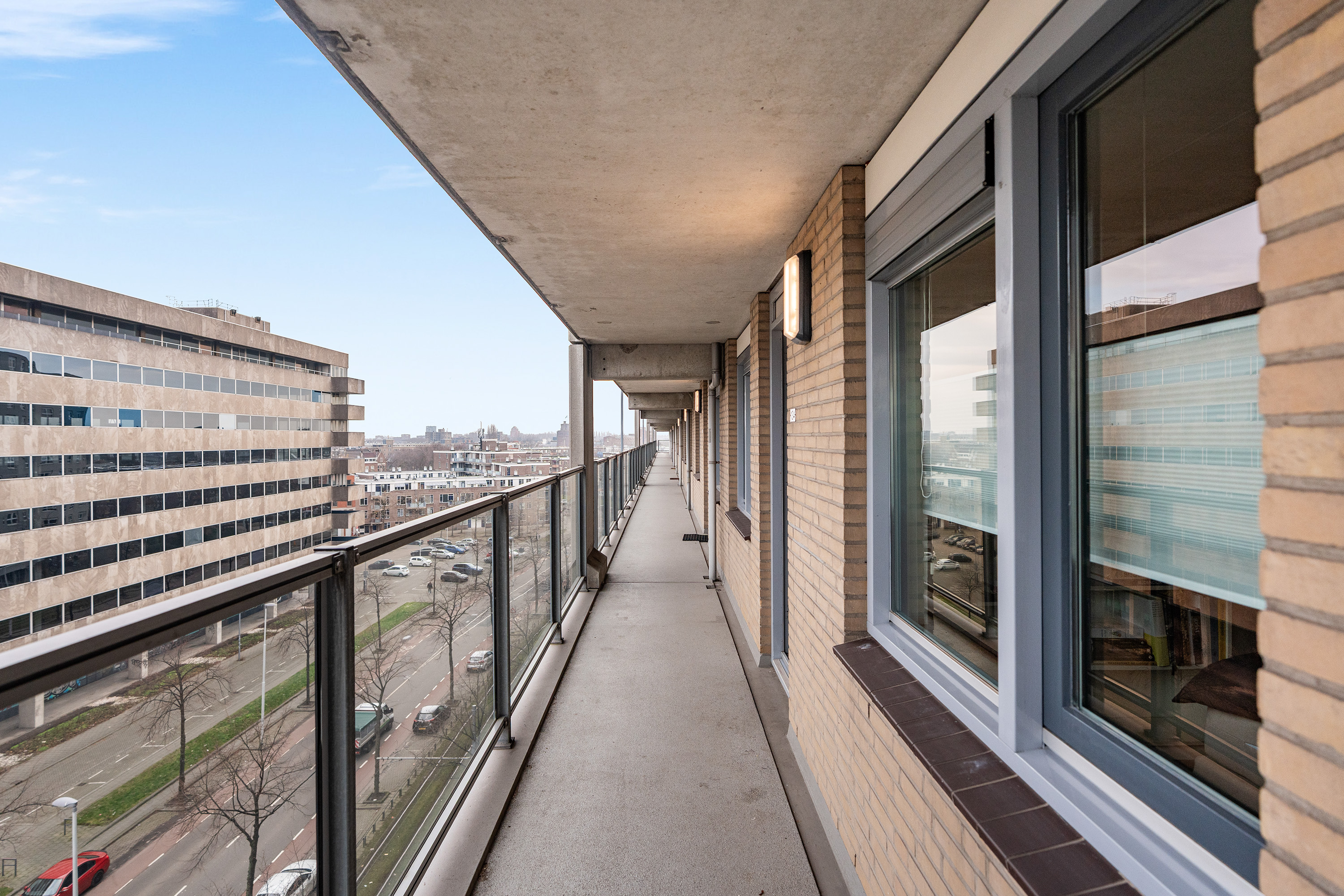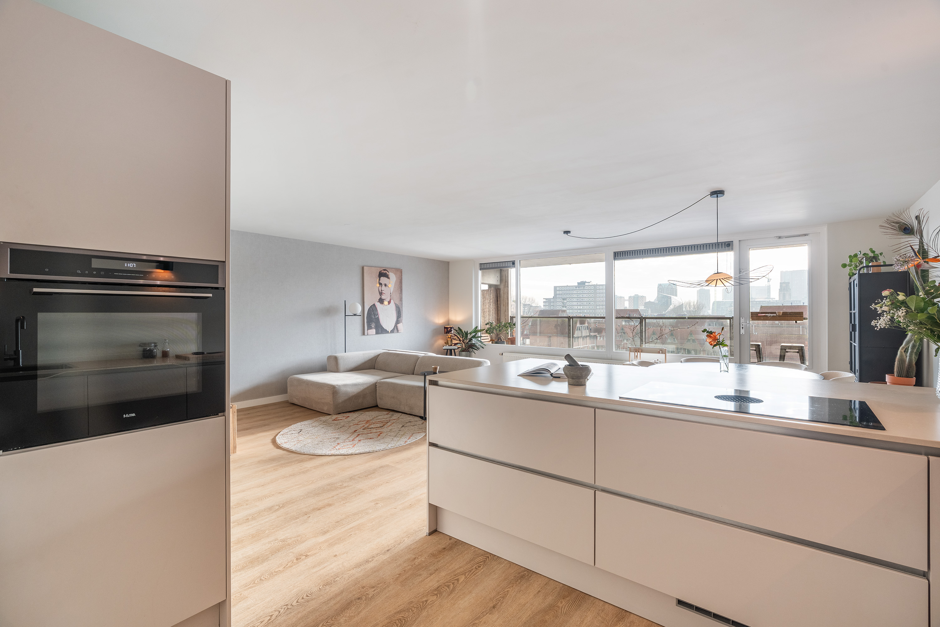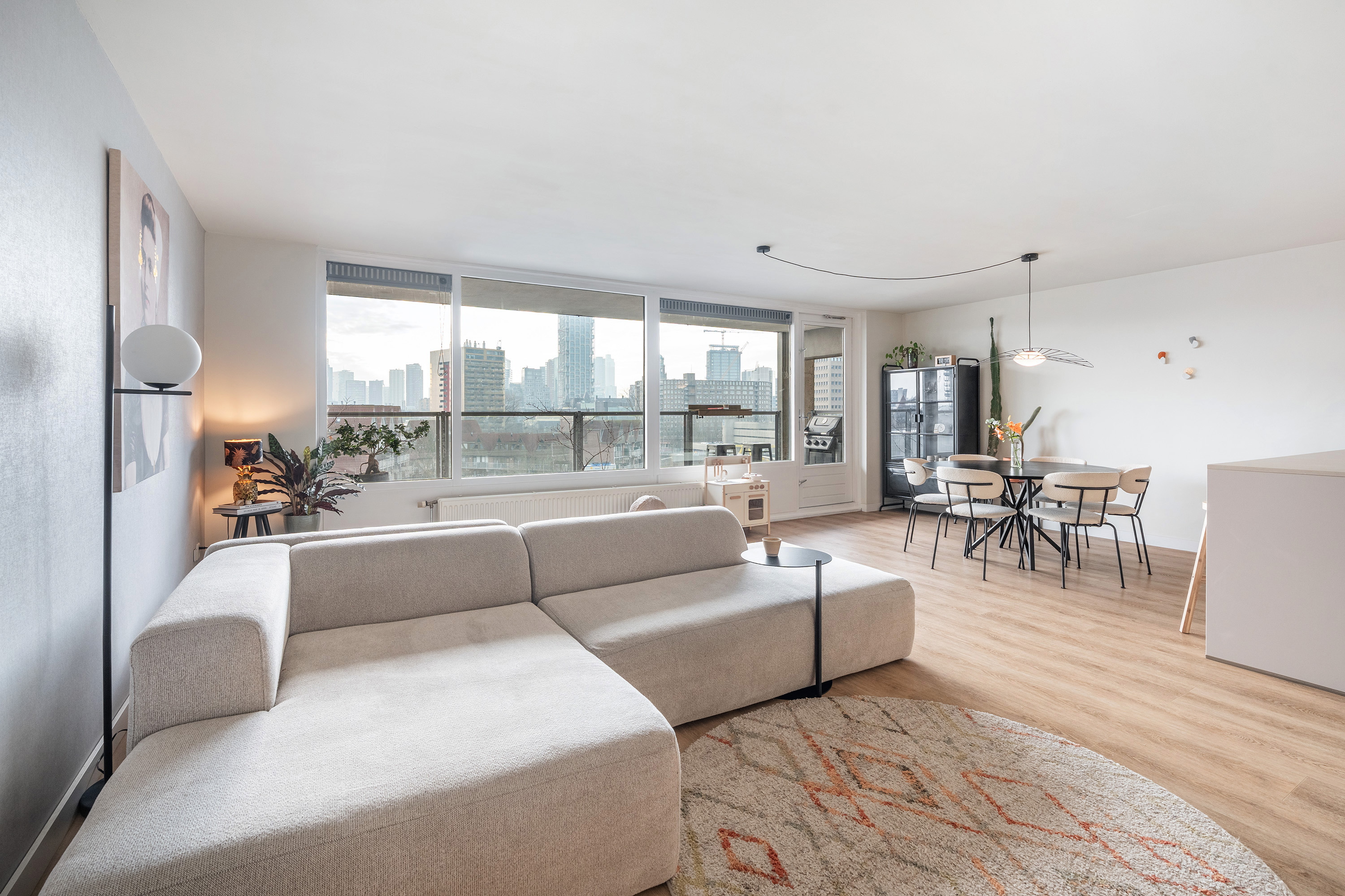 Vanuit de woonkamer stap je zó het royale balkon op van ca. 13 m2. Vanaf hier heb je een prachtig uitzicht over de Rotterdamse binnenstad. De ideale plek voor ontbijt in de ochtendzon of borrels bij zonsondergang.