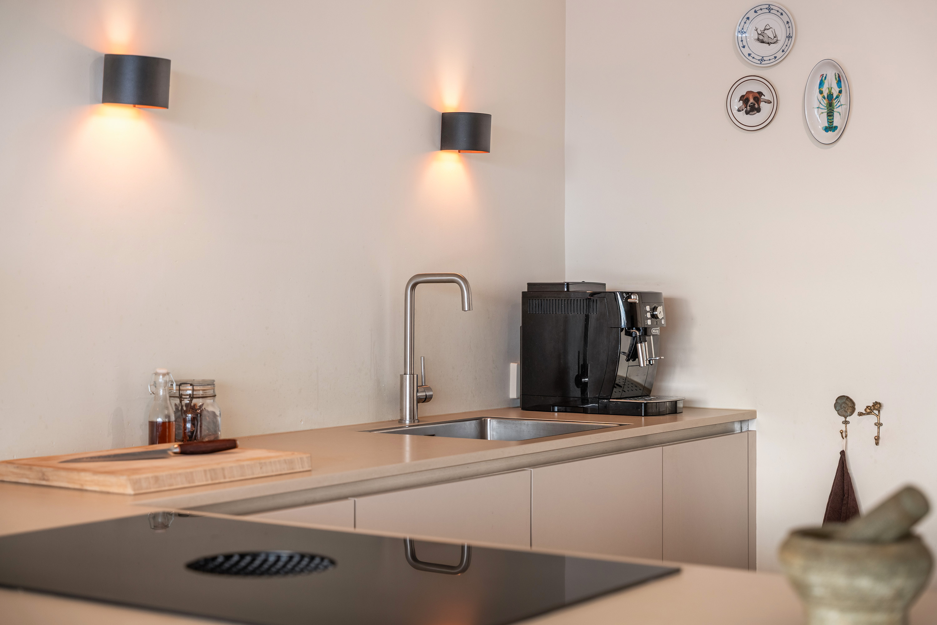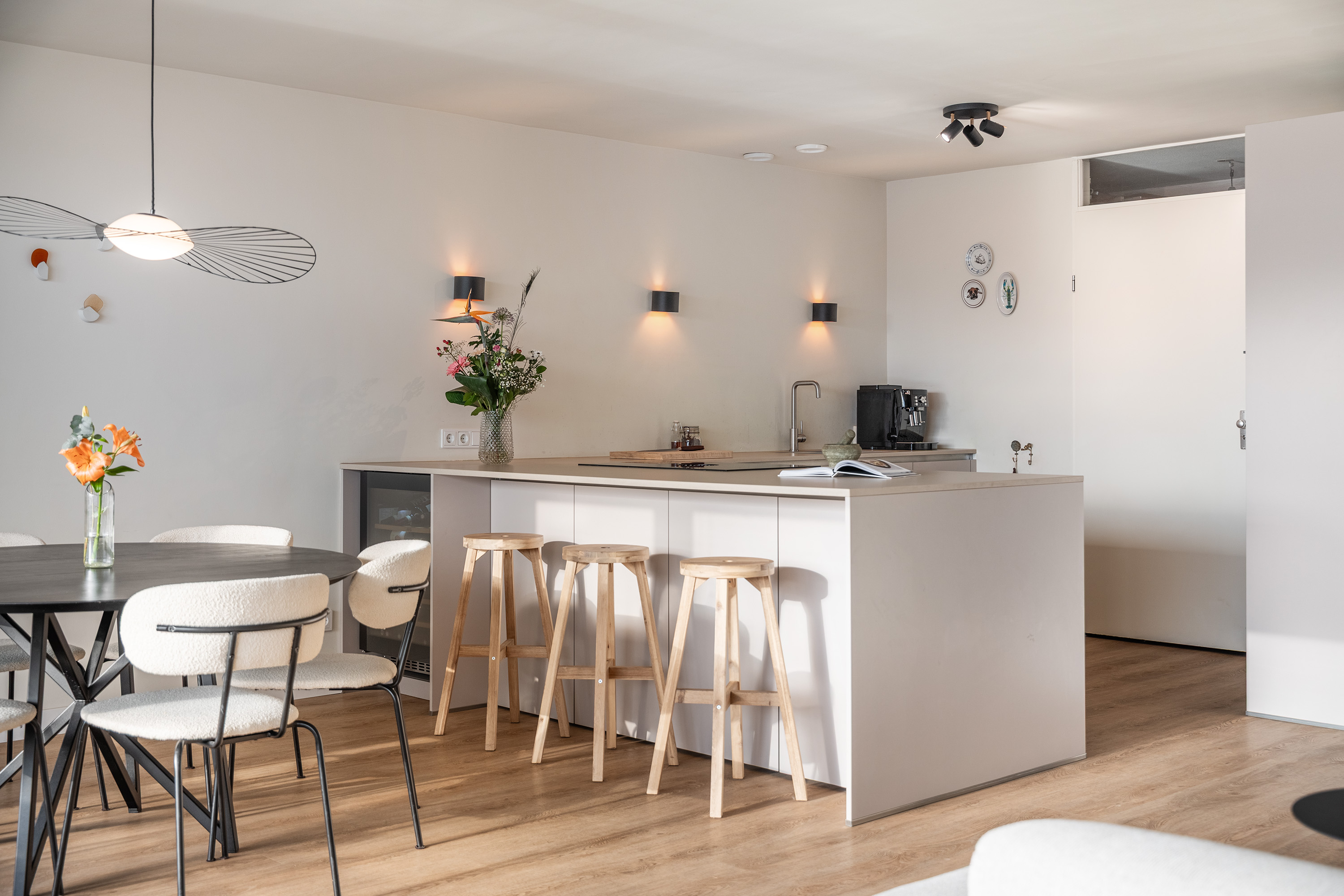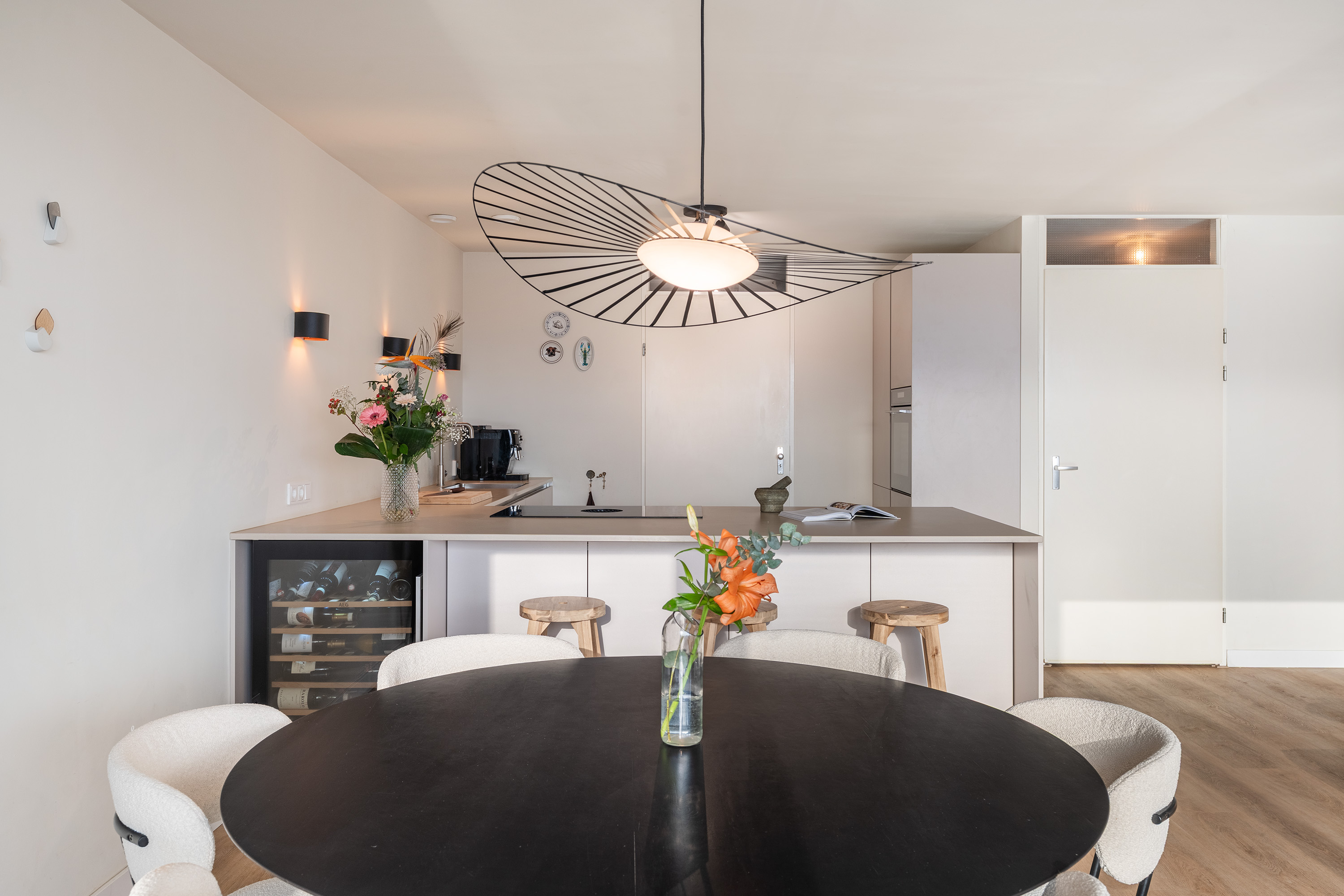 De open keuken (2021) is een absolute eyecatcher met een strakke opstelling, geïntegreerde wandspots en een bar. Hier komen functionaliteit en esthetiek samen. Greeploze kasten, een inductiekookplaat met geïntegreerde afzuiging, veel werkruimte en een wijnklimaatkast. Perfect voor de culinaire liefhebber. De keuken ademt ingetogen luxe en nodigt uit tot lange avonden koken, proeven en genieten.